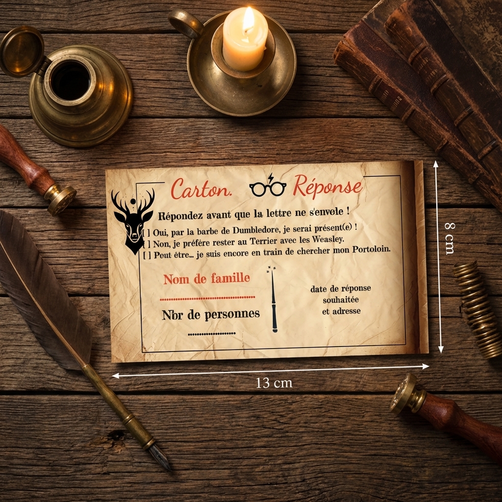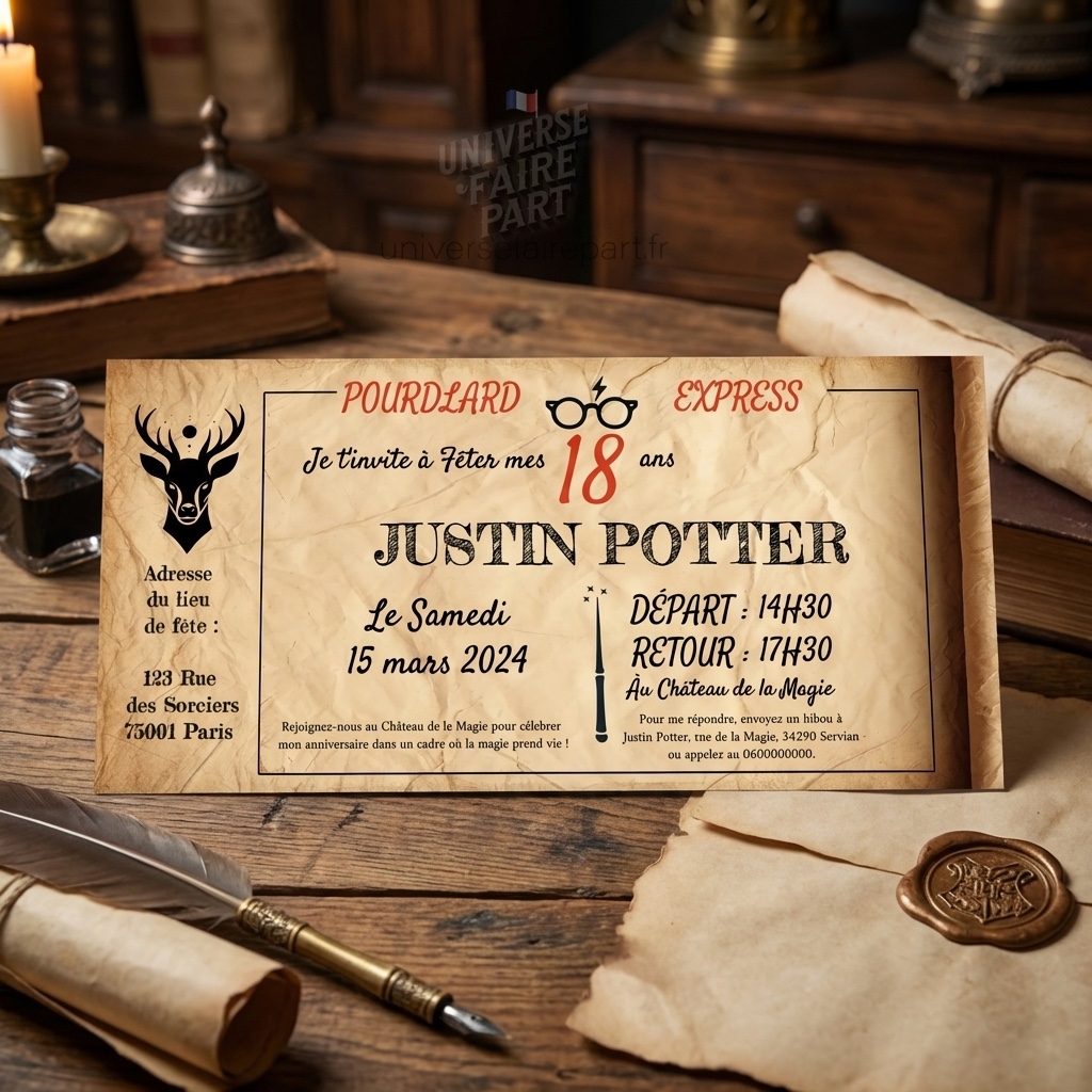 Le design présente un parchemin vieilli avec des illustrations emblématiques comme un cerf majestueux et un hibou, ainsi que des éléments iconiques tels que les lunettes et la cicatrice de Harry Potter. Chaque détail est soigneusement pensé pour transporter vos invités dans un monde de magie et de mystère.
