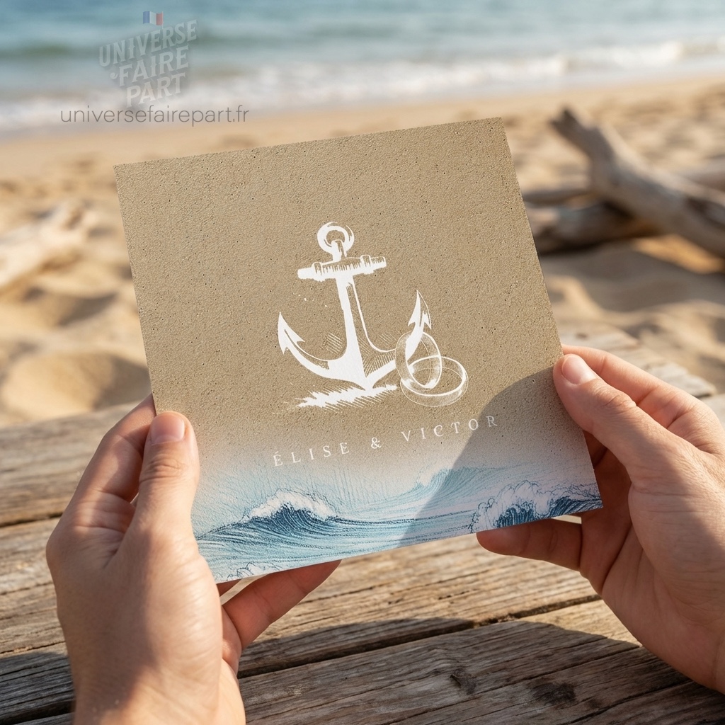 Ce carton, conçu avec un design nautique élégant, s’inscrit parfaitement dans le thème de l’amour en mer. L’illustration délicate et les détails raffinés ajoutent une touche de charme à cette invitation spéciale.