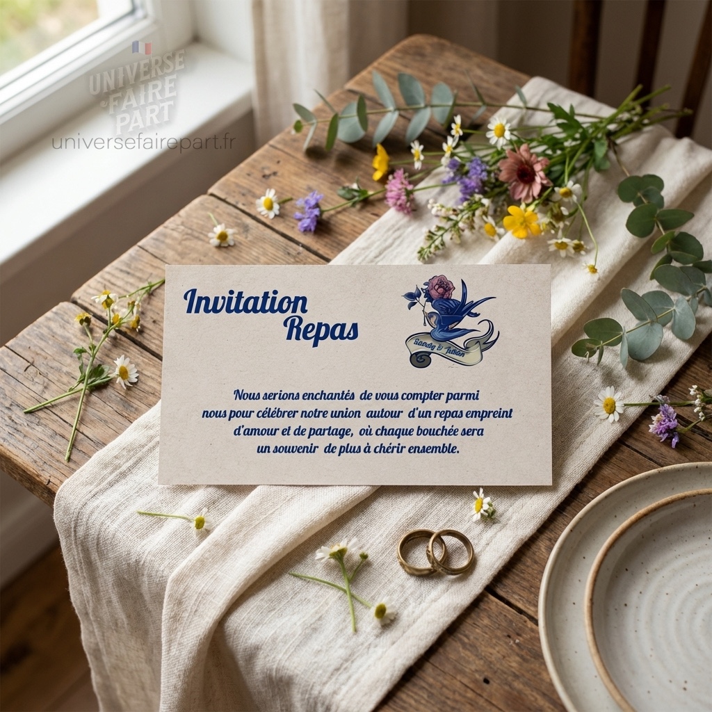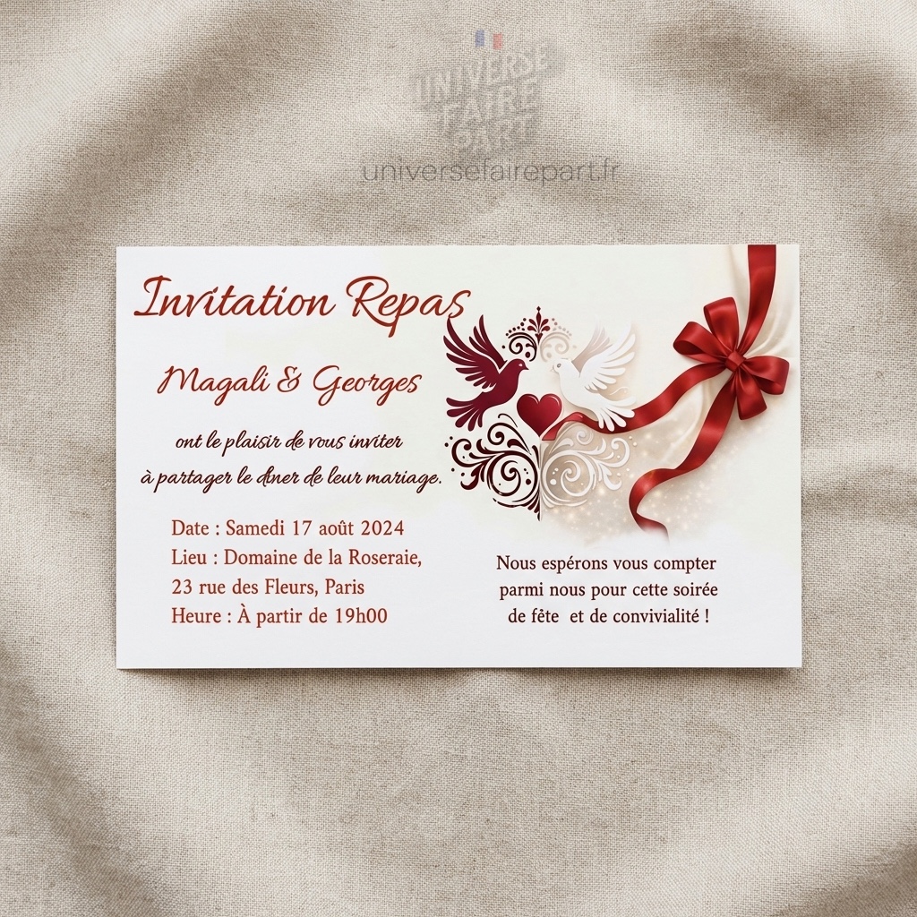 - Personnalisable : Ajoutez vos informations personnelles telles que la date, l’heure, le lieu du repas, et un message de confirmation.