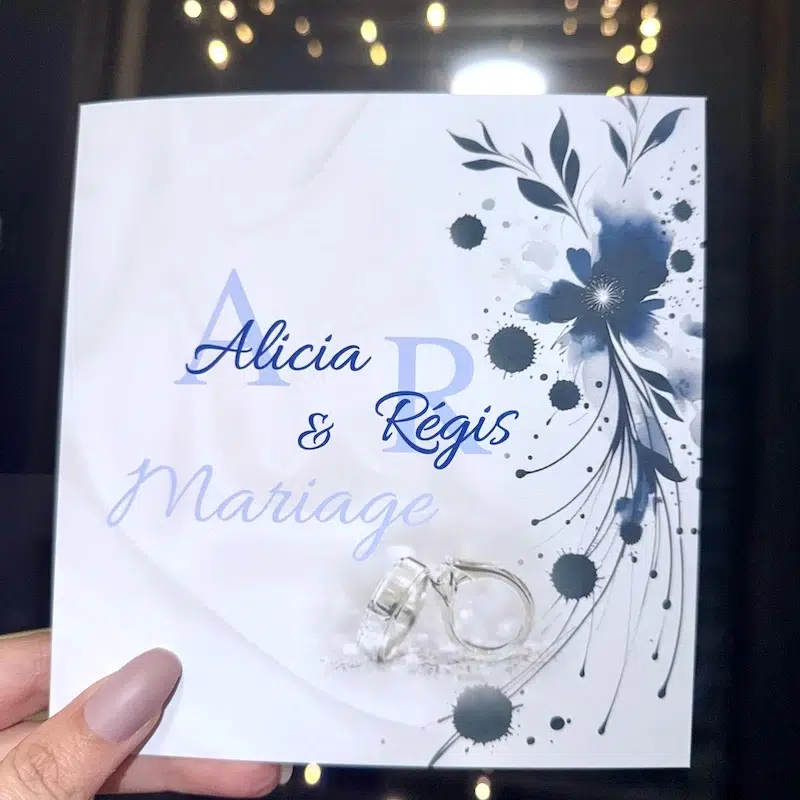 Mots-clés : carton repas mariage, invitation repas mariage, papeterie assortie, aquarelle bleue, mariage élégant, repas de noces, faire-part personnalisé, mariage raffiné.