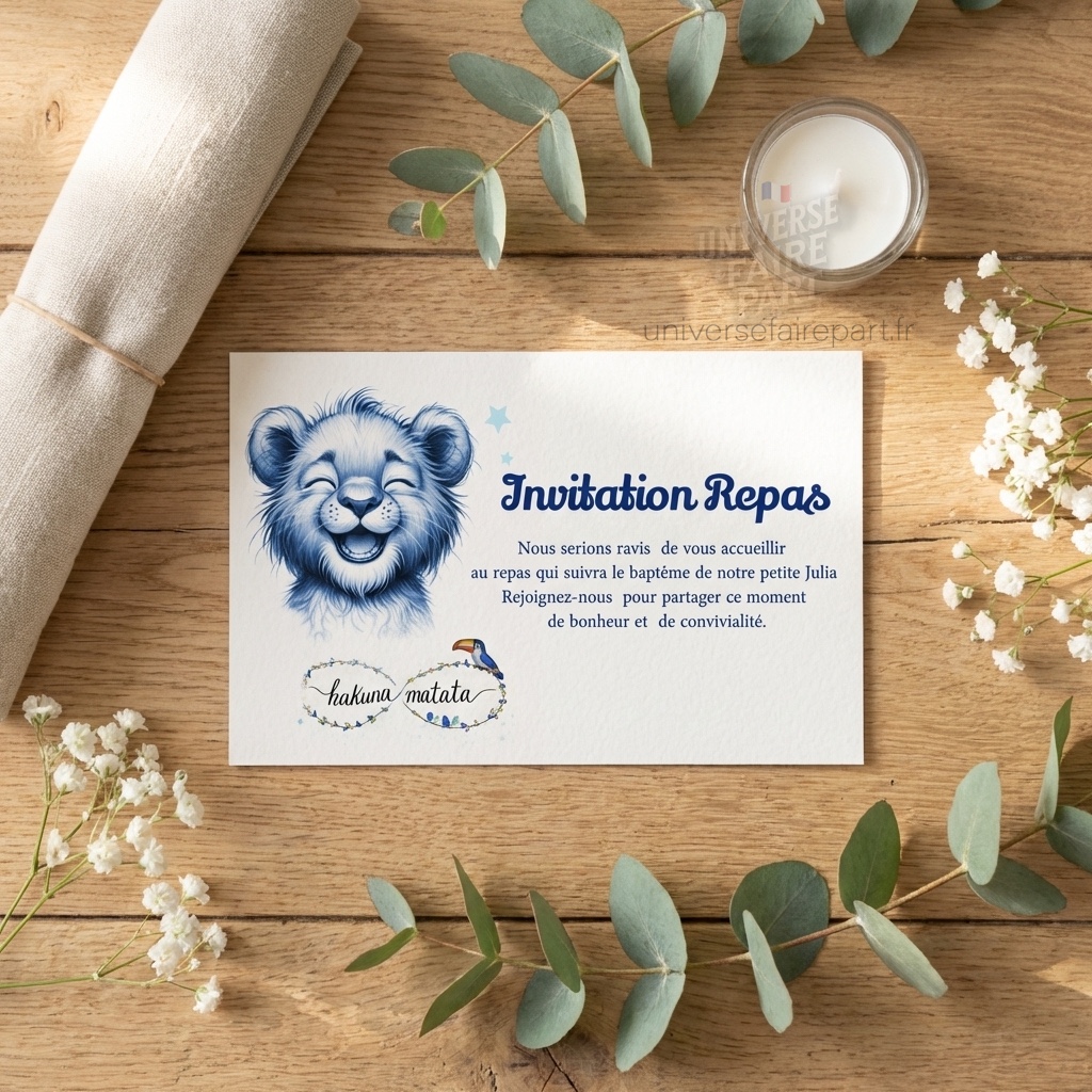 N°534.1- Carton repas original Roi Lion crayonné en bleu pour naissance ou Baptême