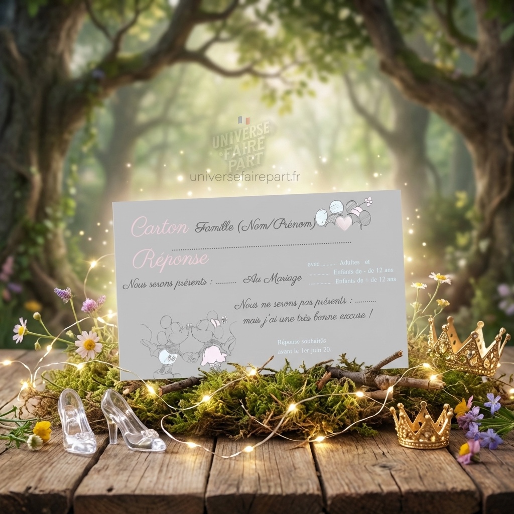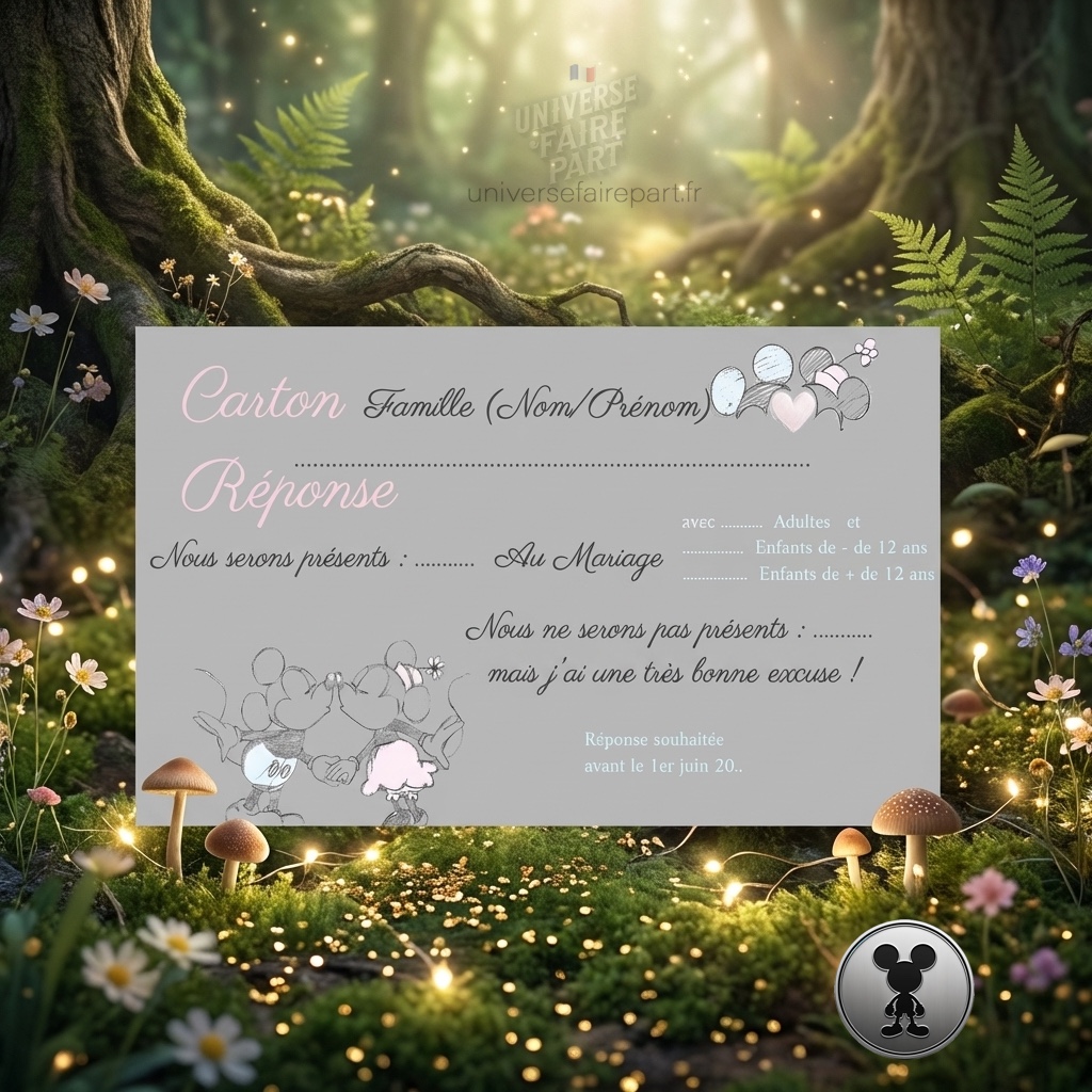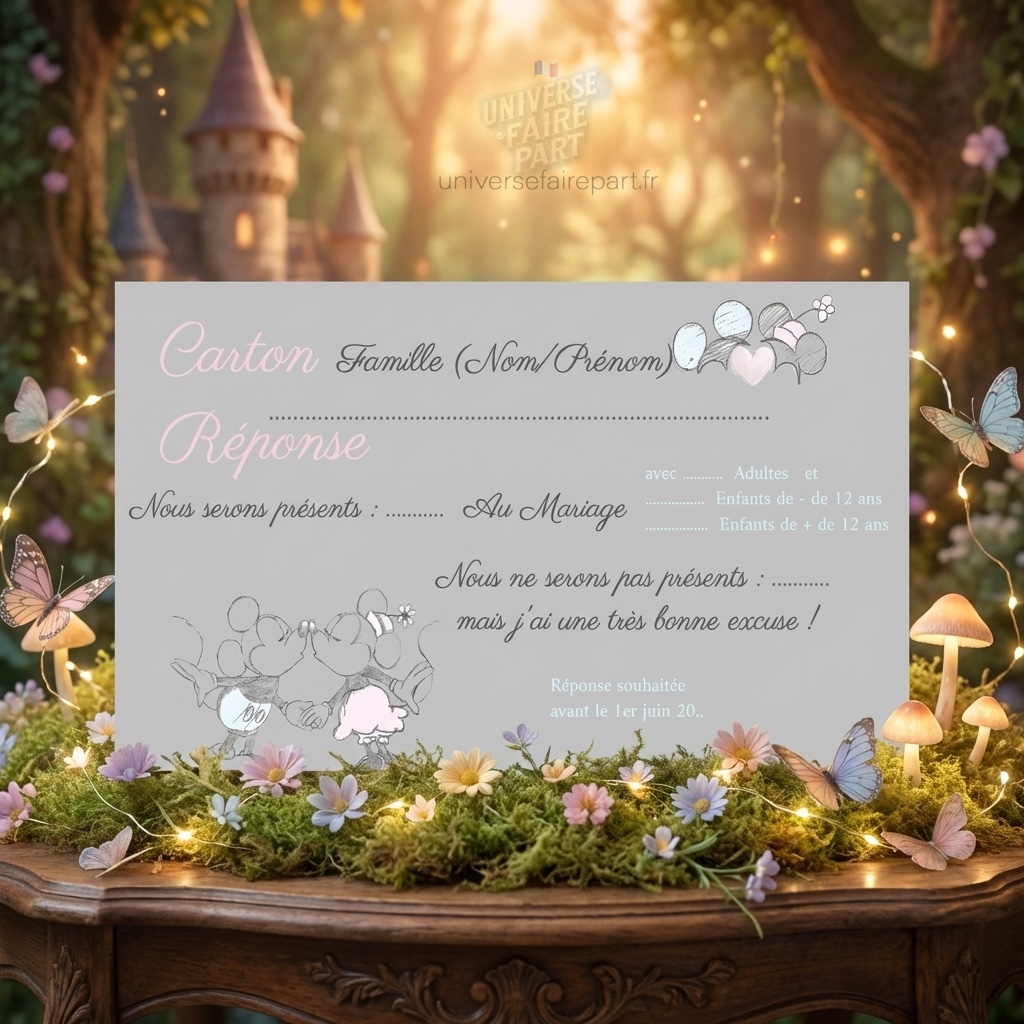 - Thème Magique : Inspiré par l’univers enchanteur de Mickey et Minnie, ce carton réponse présente des motifs féeriques qui raviront vos invités.