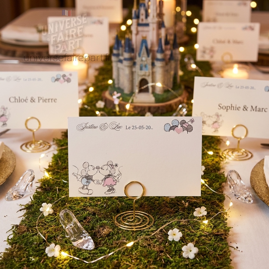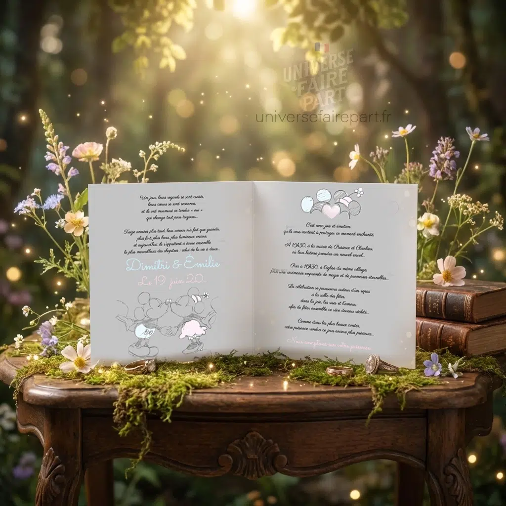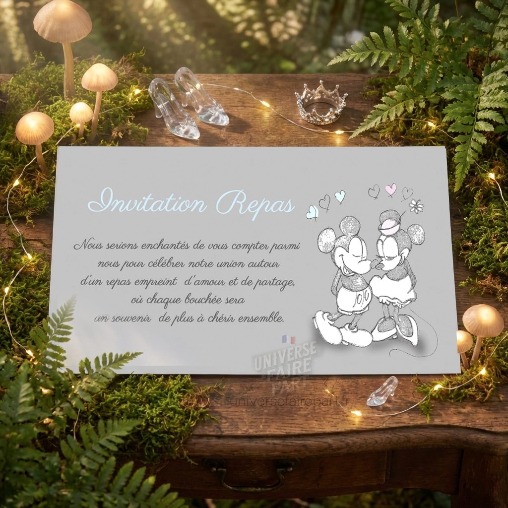 - Thème Magique : Inspiré par l’univers enchanteur de Mickey et Minnie, ce carton réponse présente des motifs féeriques qui raviront vos invités.