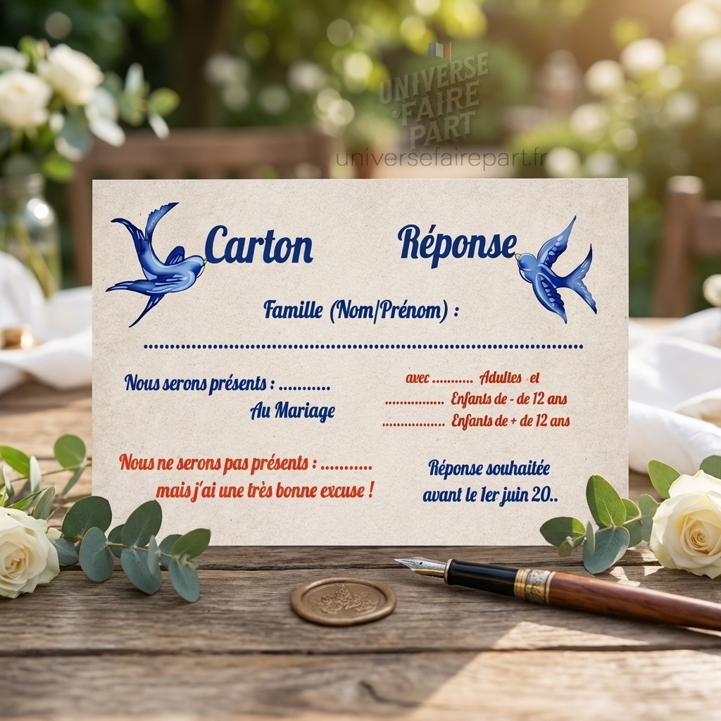 - Design Coordonné : Harmonisé avec le design de votre faire-part de mariage, ce carton réponse reprend les mêmes couleurs et éléments graphiques pour une présentation cohérente et esthétique.