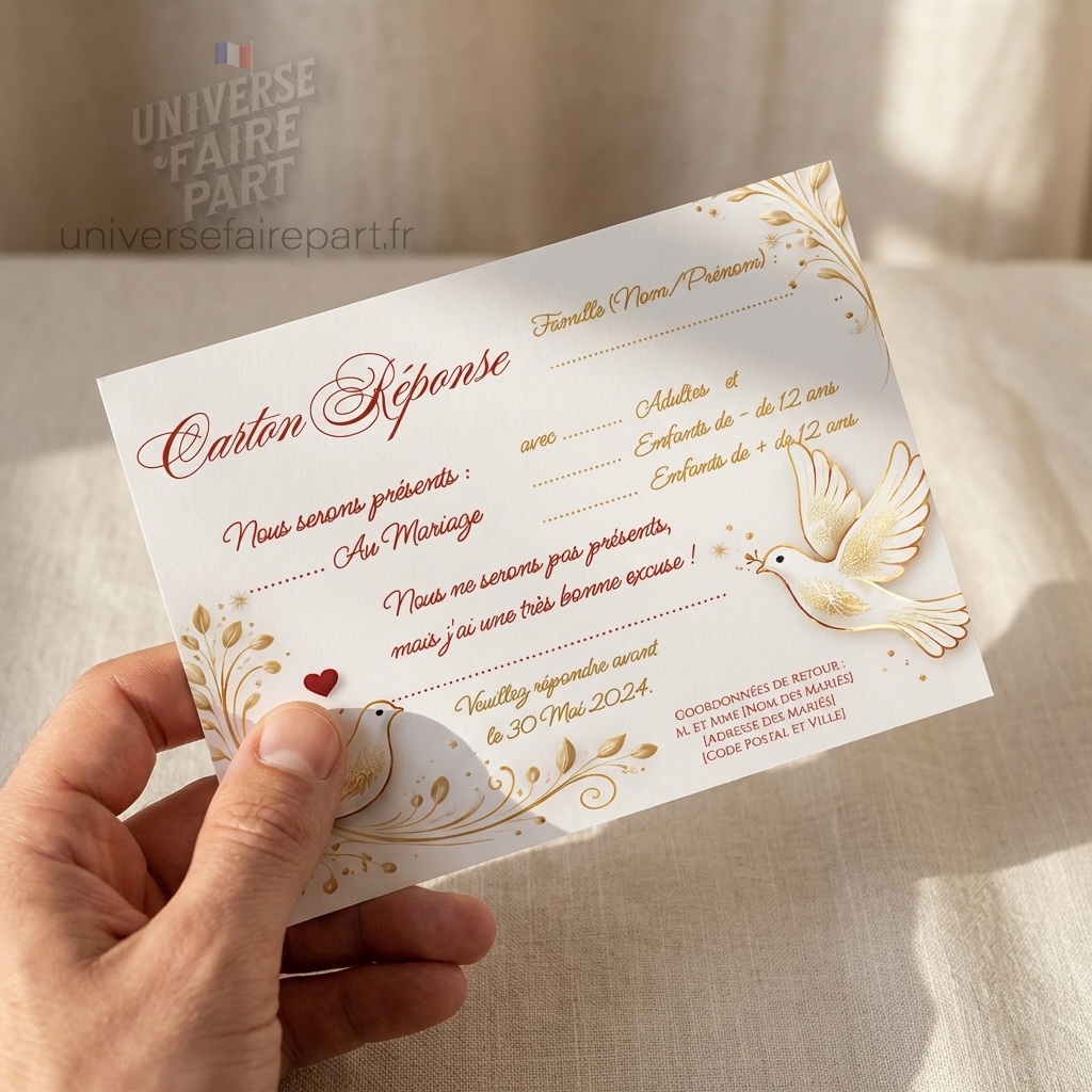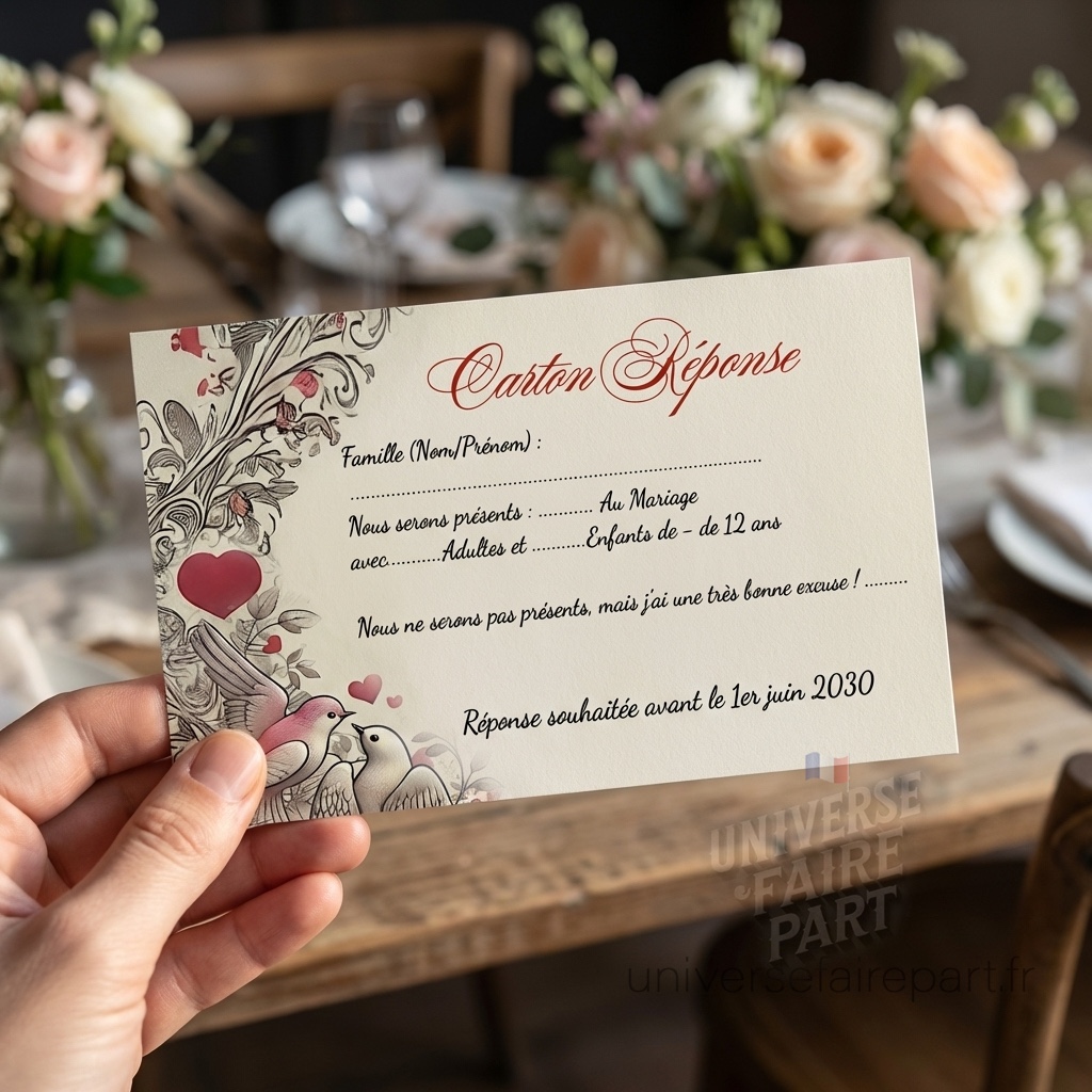 Avec ses nuances pastel et ses touches lumineuses, ce carton promet une anticipation enchantée de votre jour spécial. Il incarne l’essence même de l’élégance, invitant chaque destinataire à répondre à l’appel de la célébration avec un simple geste, tout en participant à la danse délicate de votre amour florissant.