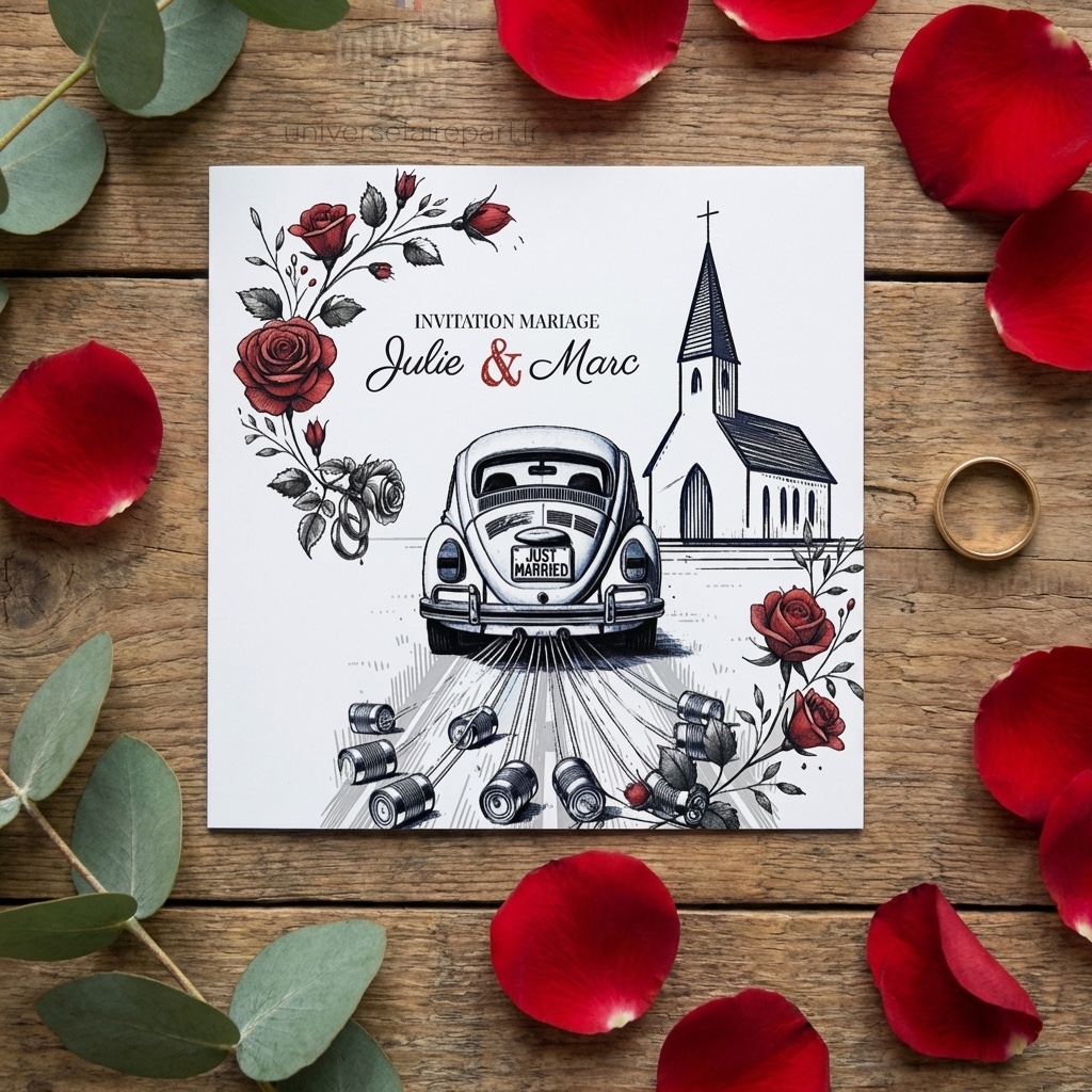 Ajoutez une touche de charme et de romantisme à vos invitations de mariage avec notre carton réponse « Un amour de coccinelle ». Ce carton réponse, conçu dans un style croquis élégant, présente une illustration de roses rouges, d’alliances entrelacées et de la célèbre Volkswagen Coccinelle ornée de décorations de mariage.