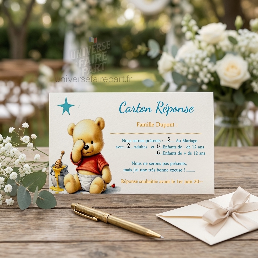 Faire-Part de Naissance « Winnie L’ours Malin en Bleu » – Carton Réponse N°539.1