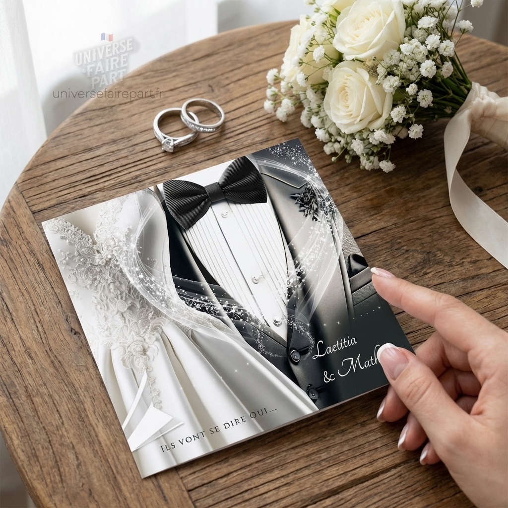 L’étiquette bouteille « Élégance et Passion » apporte une touche raffinée et personnalisée à votre célébration. Reprenant le design élégant en noir et blanc du faire-part, cette étiquette incorpore le motif du costume pour une harmonie parfaite avec le thème de votre événement. Parfaite pour personnaliser les bouteilles de vin, d’eau ou tout autre breuvage, elle transforme chaque bouteille en un élément décoratif qui contribue à l’ambiance élégante de votre table. Cette étiquette n’est pas seulement un détail décoratif ; elle raconte une histoire, celle de votre journée spéciale, en ajoutant une note de sophistication et de cohérence à votre réception.
