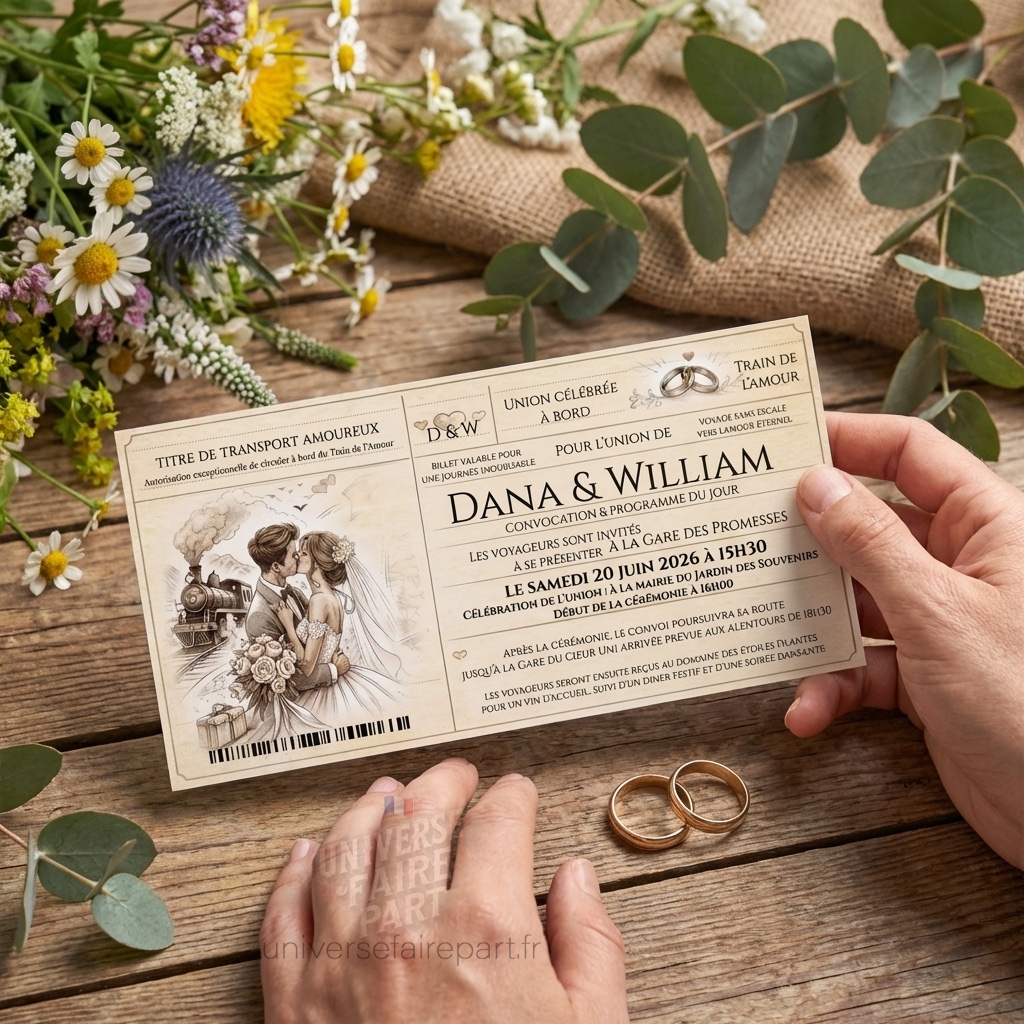- Design Cohérent : Un style vintage harmonieux avec des illustrations détaillées de trains et de motifs romantiques, en parfaite harmonie avec le faire-part, le carton réponse et le rond collant.
