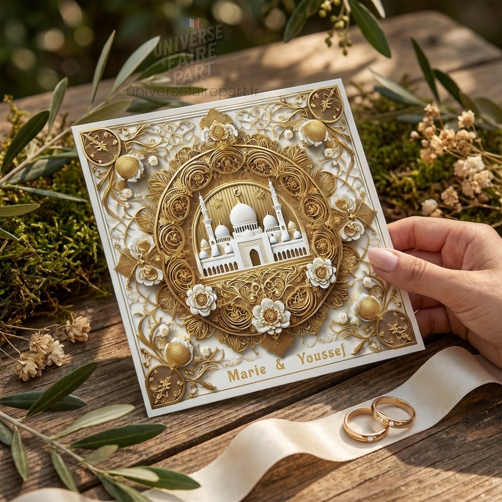 Mots-clés : faire-part mariage oriental, invitation mariage musulman, faire-part mariage personnalisé, mariage oriental, motifs arabesques dorés, mariage musulman traditionnel, faire-part mariage Aladdin, invitation mariage Agrabah, faire-part musulman.
