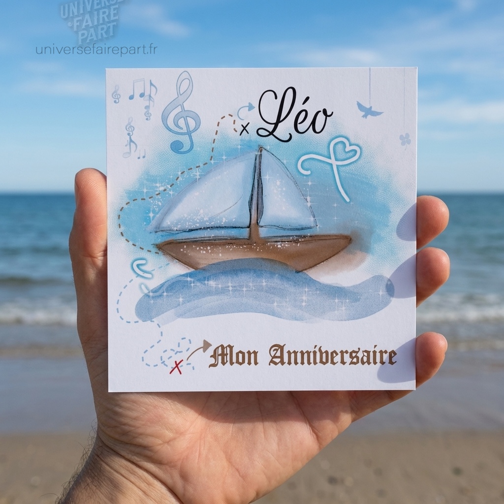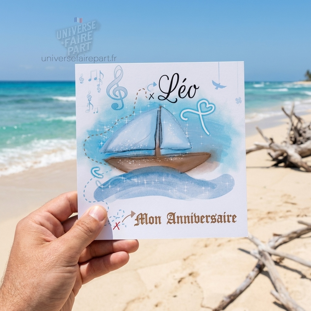 Illustré avec un magnifique bateau naviguant sur des eaux bleu azur, ce faire-part invite vos invités à voguer vers l’aventure avec vous. Les illustrations détaillées et les couleurs vives créent une atmosphère captivante et excitante, idéale pour une fête d’anniversaire, une baby shower ou toute autre célébration joyeuse. Le design artistique et le souci du détail garantissent que chaque faire-part est une véritable œuvre d’art qui saura captiver et émerveiller vos invités.