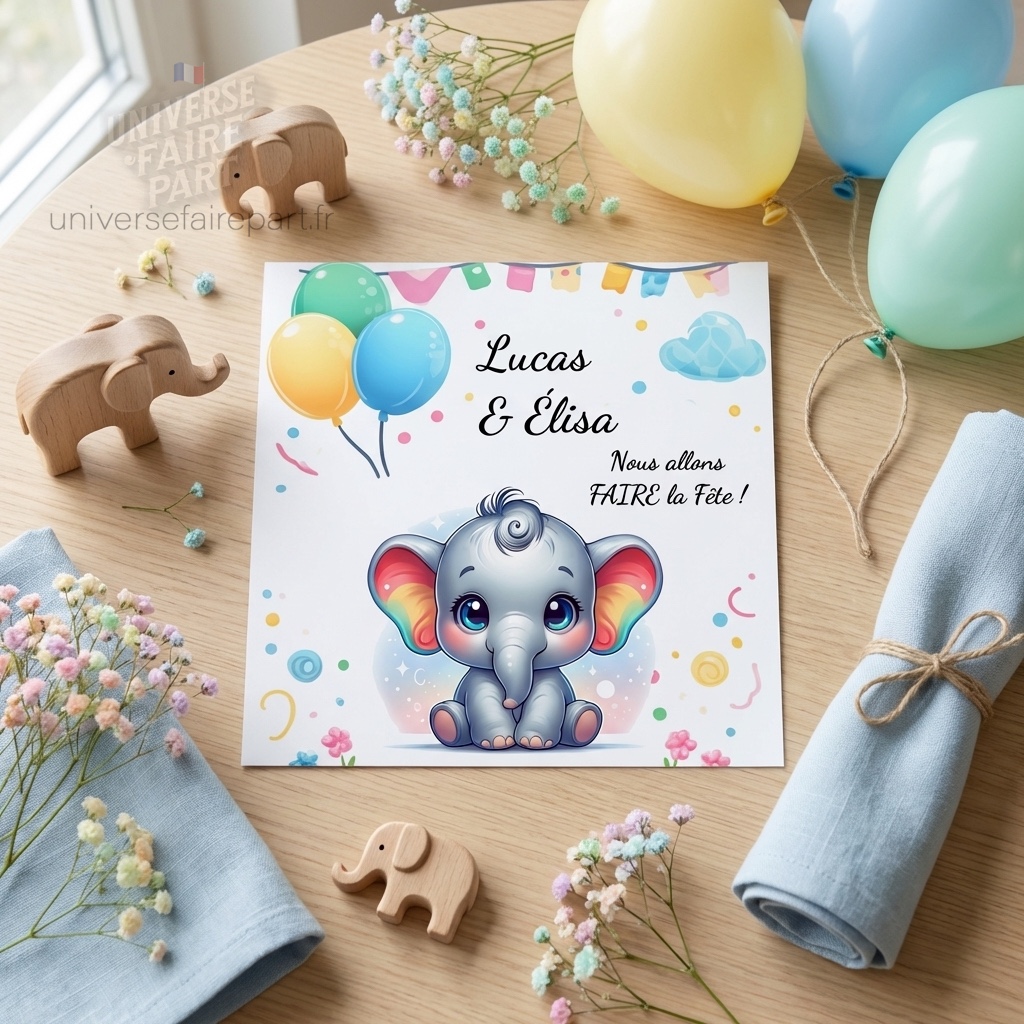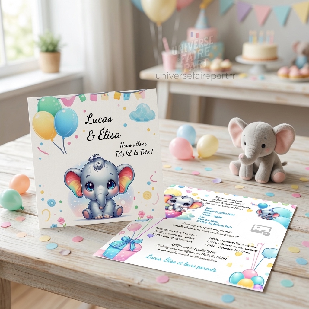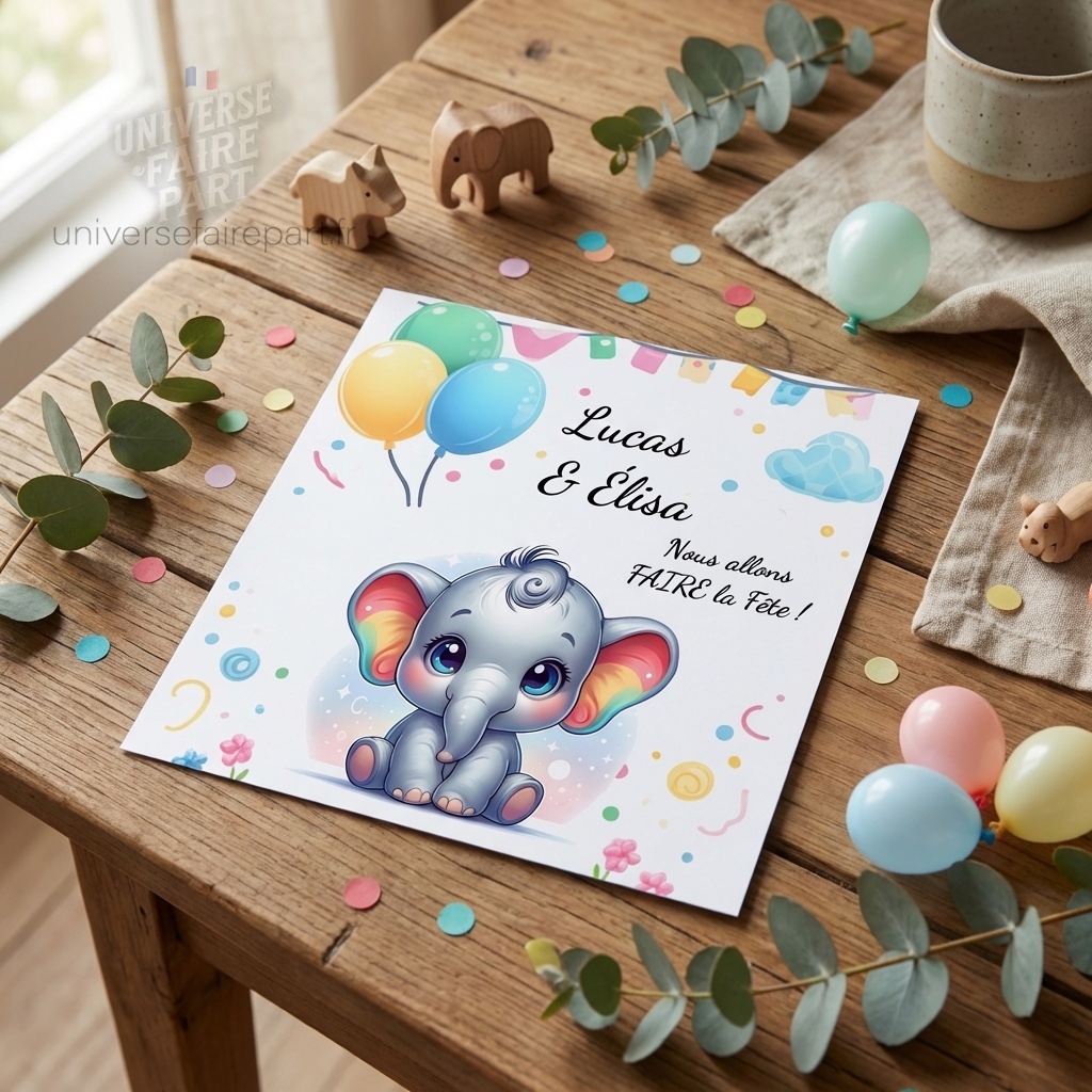 Offrez à vos enfants une fête d’anniversaire mémorable avec notre faire-part sur le thème des éléphants et des ballons. Parfait pour un double anniversaire, ce design enchanteur et coloré apportera joie et excitation à vos invités.