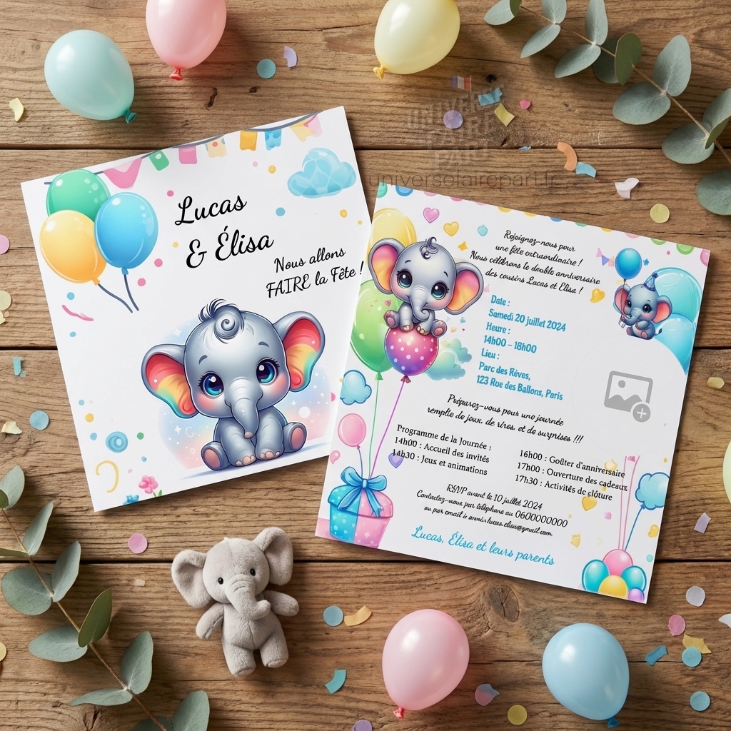 Description : Ce faire-part d’anniversaire, avec son thème joyeux d’éléphants et de ballons, est conçu pour captiver vos invités dès le premier regard. Le design ludique et coloré apporte une touche de magie et de fantaisie à votre événement. Personnalisable avec toutes les informations nécessaires, ce faire-part est parfait pour célébrer un double anniversaire rempli de bonheur et d’amour.