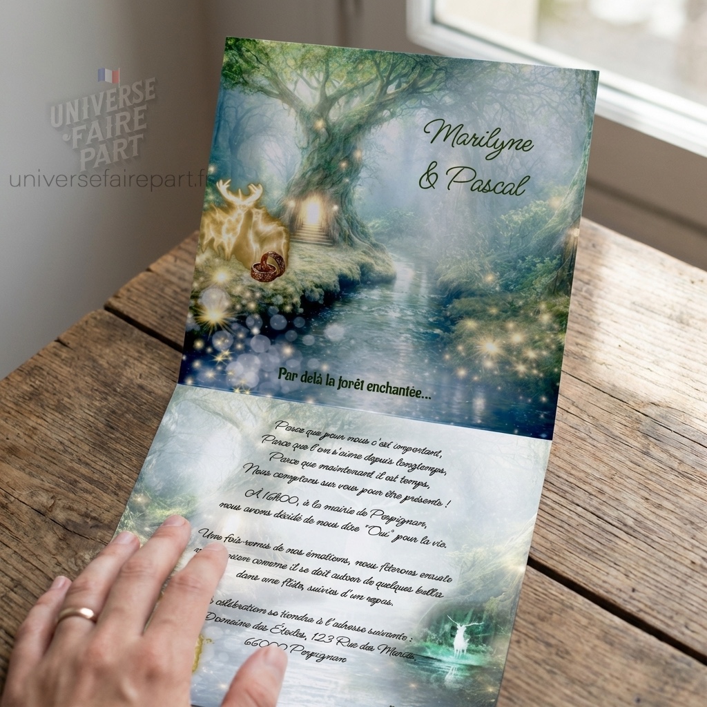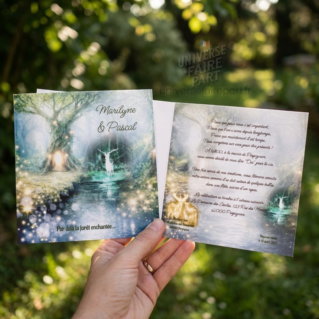 Idéal pour les événements organisés en plein air ou ceux qui souhaitent capturer l’essence de l’enchantement, ce faire-part est une véritable œuvre d’art. Il promet non seulement d’annoncer votre événement, mais aussi d’en faire un prologue mémorable, annonçant un chapitre de vie rempli de beauté et de magie. »