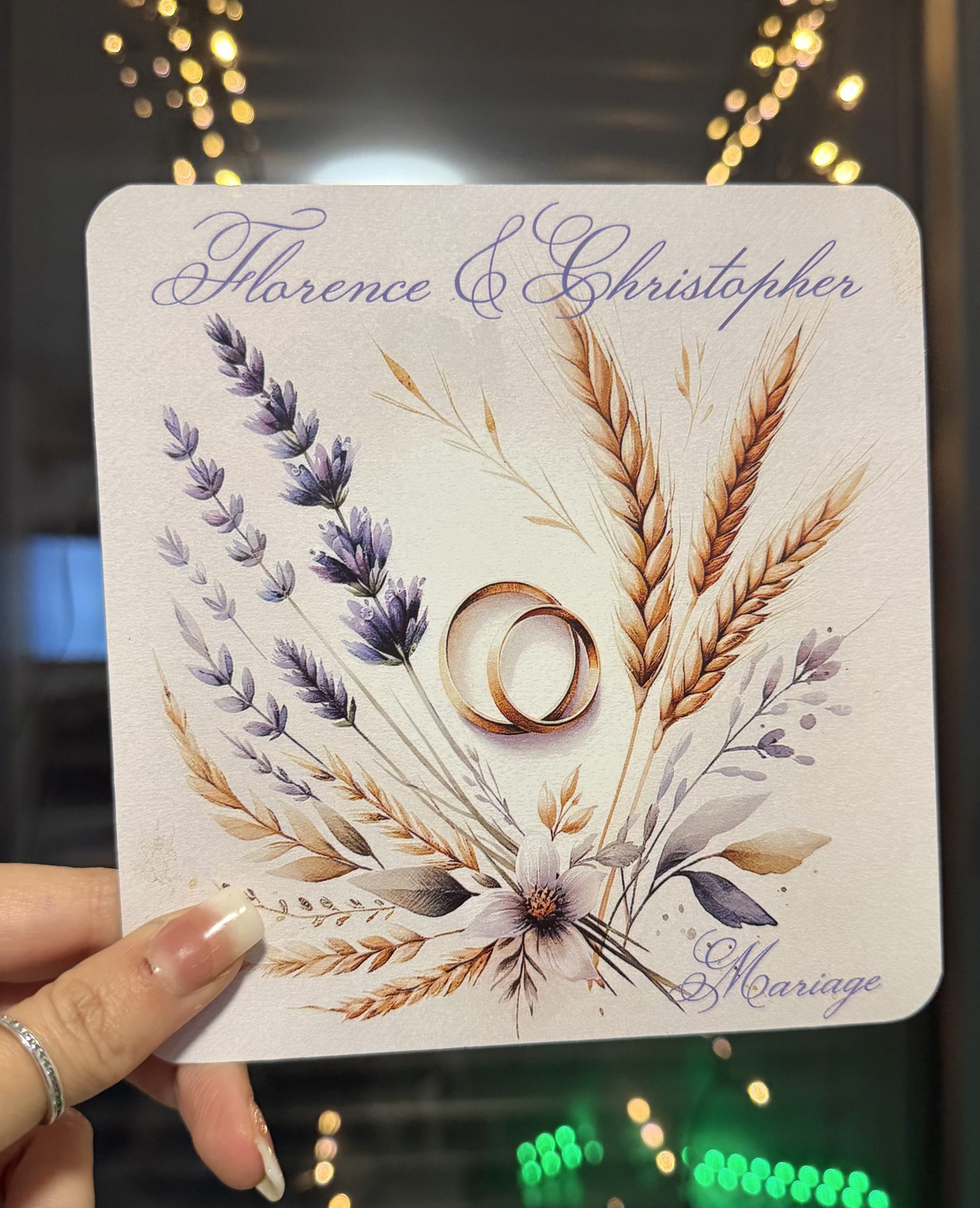 Dès le premier regard, vos invités seront charmés par les délicates illustrations en aquarelle, représentant des brins de lavande et des épis de blé qui s’entrelacent harmonieusement. Au centre, les noms des futurs mariés sont mis en lumière, accompagnés d’une citation inspirante, rappelant l’amour simple et sincère.