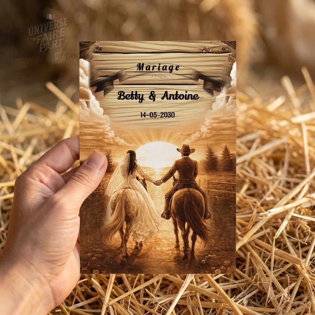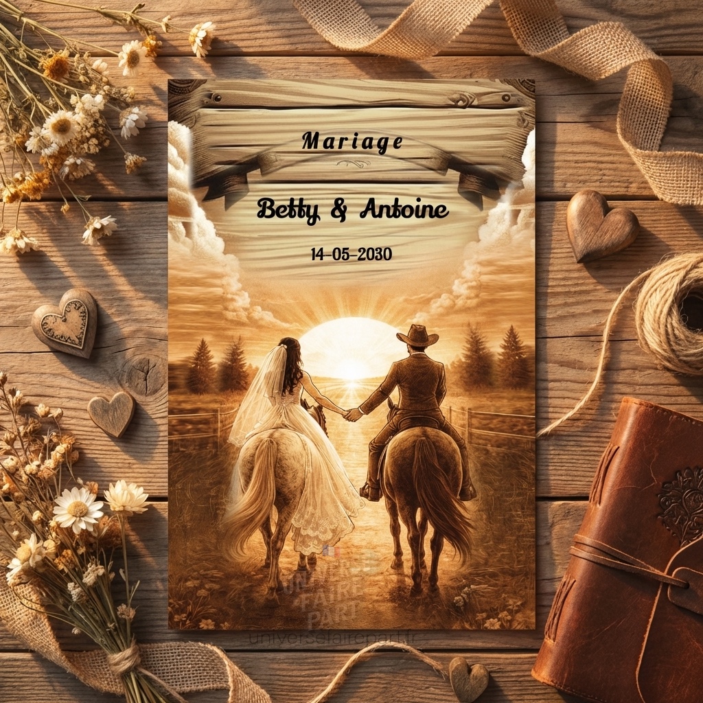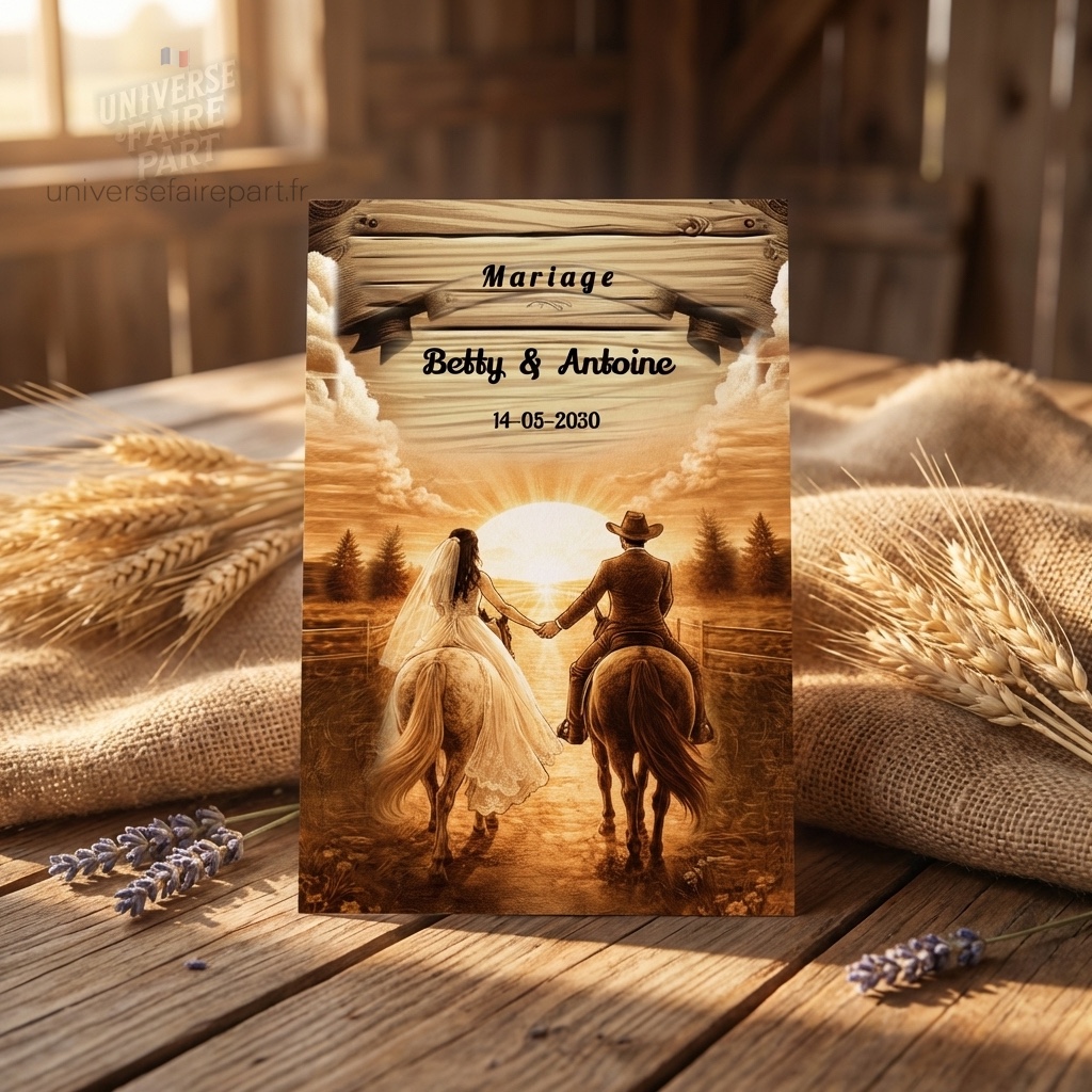 - Invitez vos proches à célébrer votre union avec une touche d’authenticité et de charme western grâce à notre faire-part « Cowboy Mariage Country ». Ce design unique capture l’essence de l’aventure et de la romance à travers des éléments rustiques et un paysage pittoresque.
