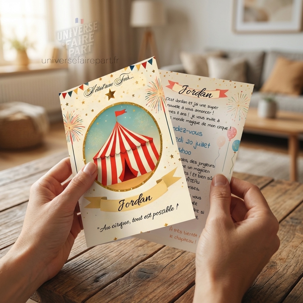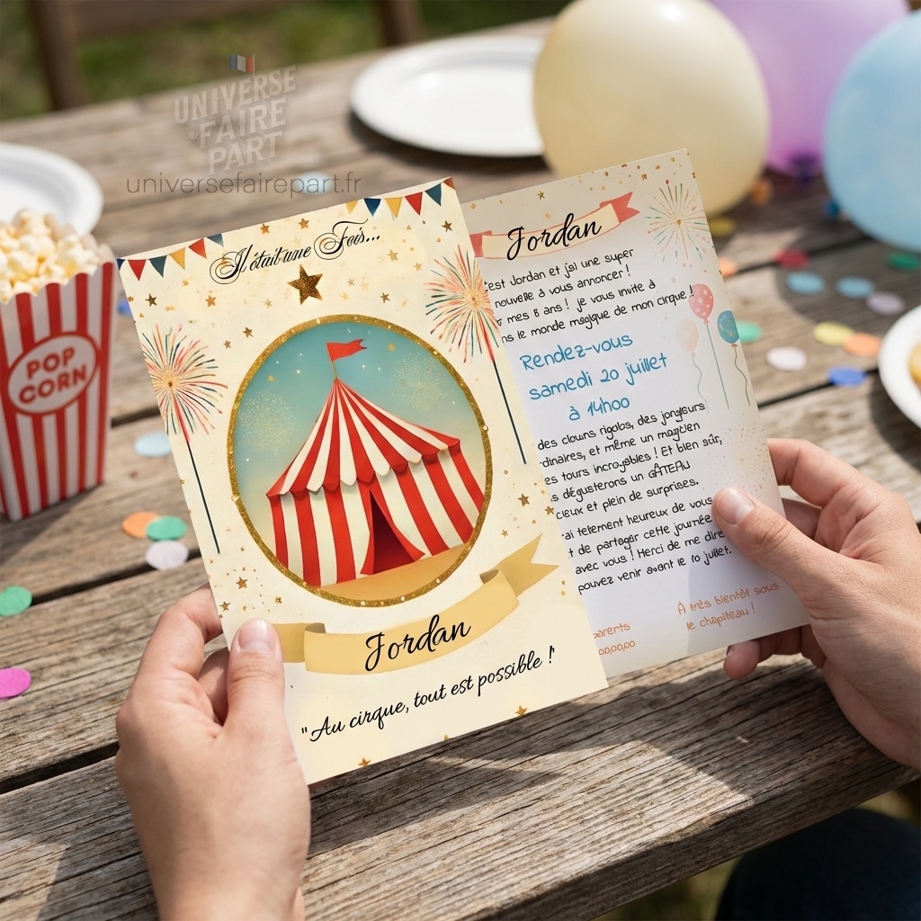 mots clés : invitation, anniversaire, Jordan, cirque, chapiteau, fête, étoiles, feu d’artifice, rêve,