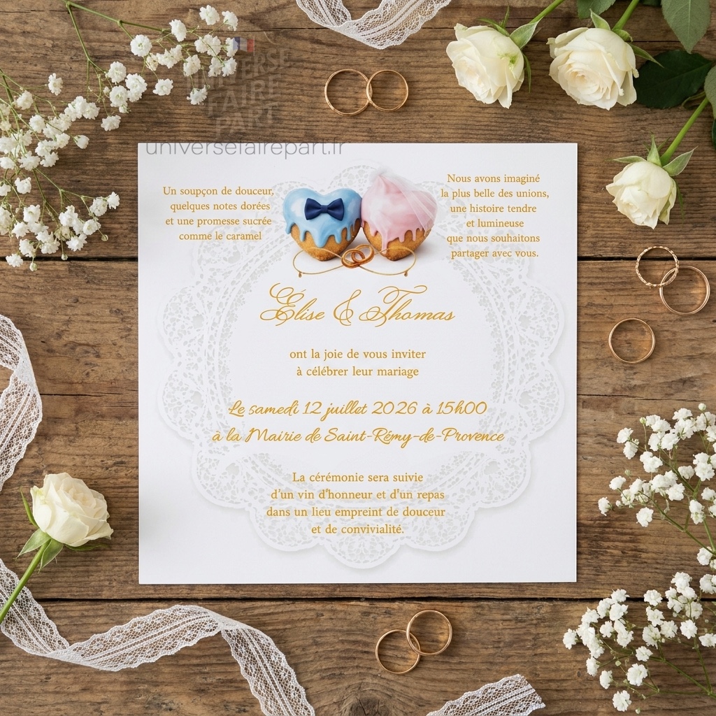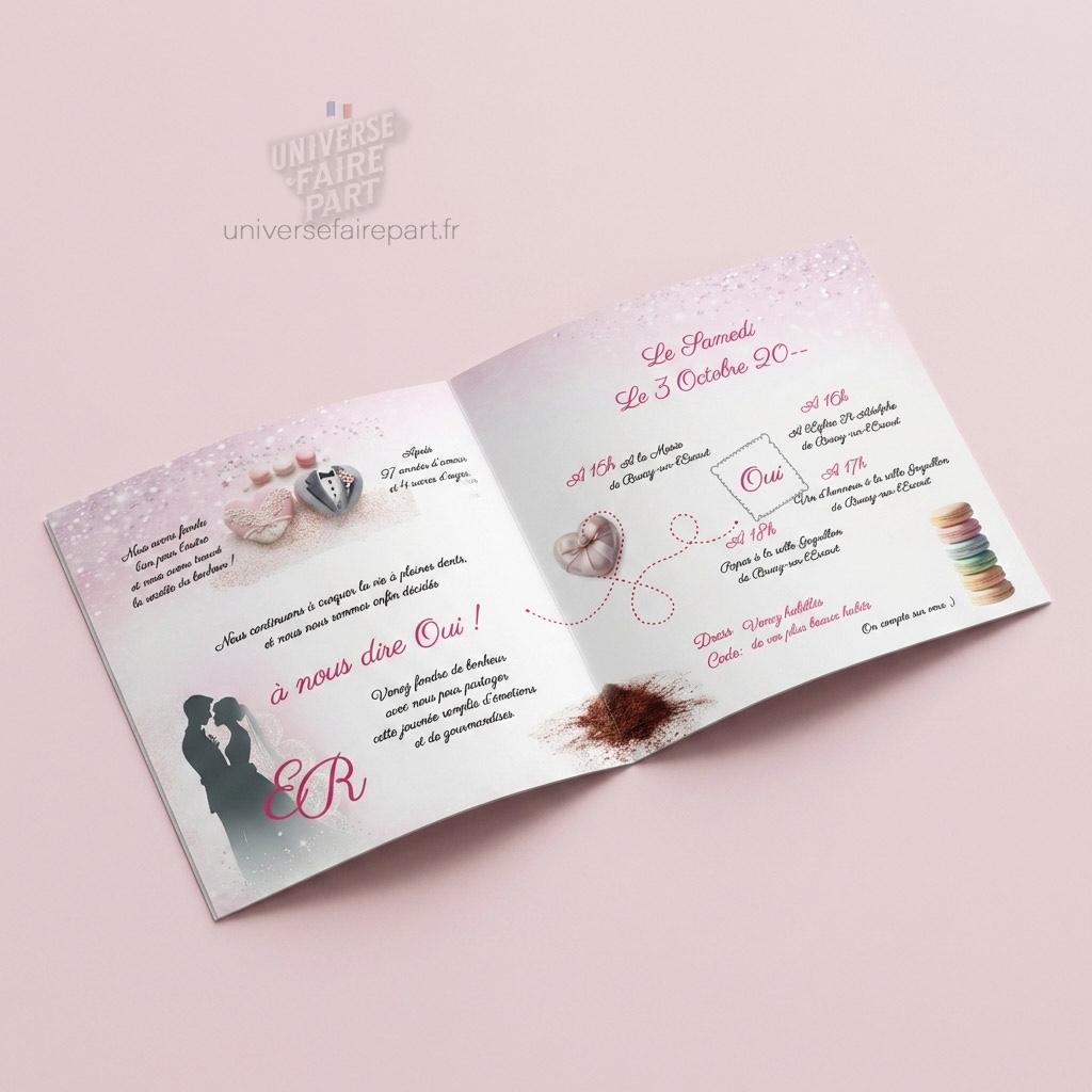 Notre faire-part gourmandise Macarons d’Amour – Livret est idéal pour ceux qui souhaitent ajouter une note sucrée et festive à leur invitation. Que ce soit pour un mariage romantique, une naissance joyeuse ou un baptême spécial, cette invitation saura capturer l’attention de vos invités et les inviter à célébrer avec vous.