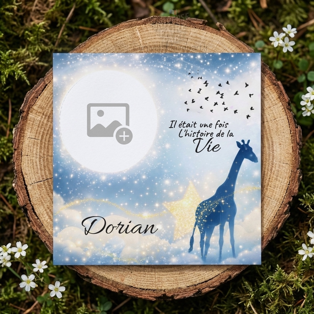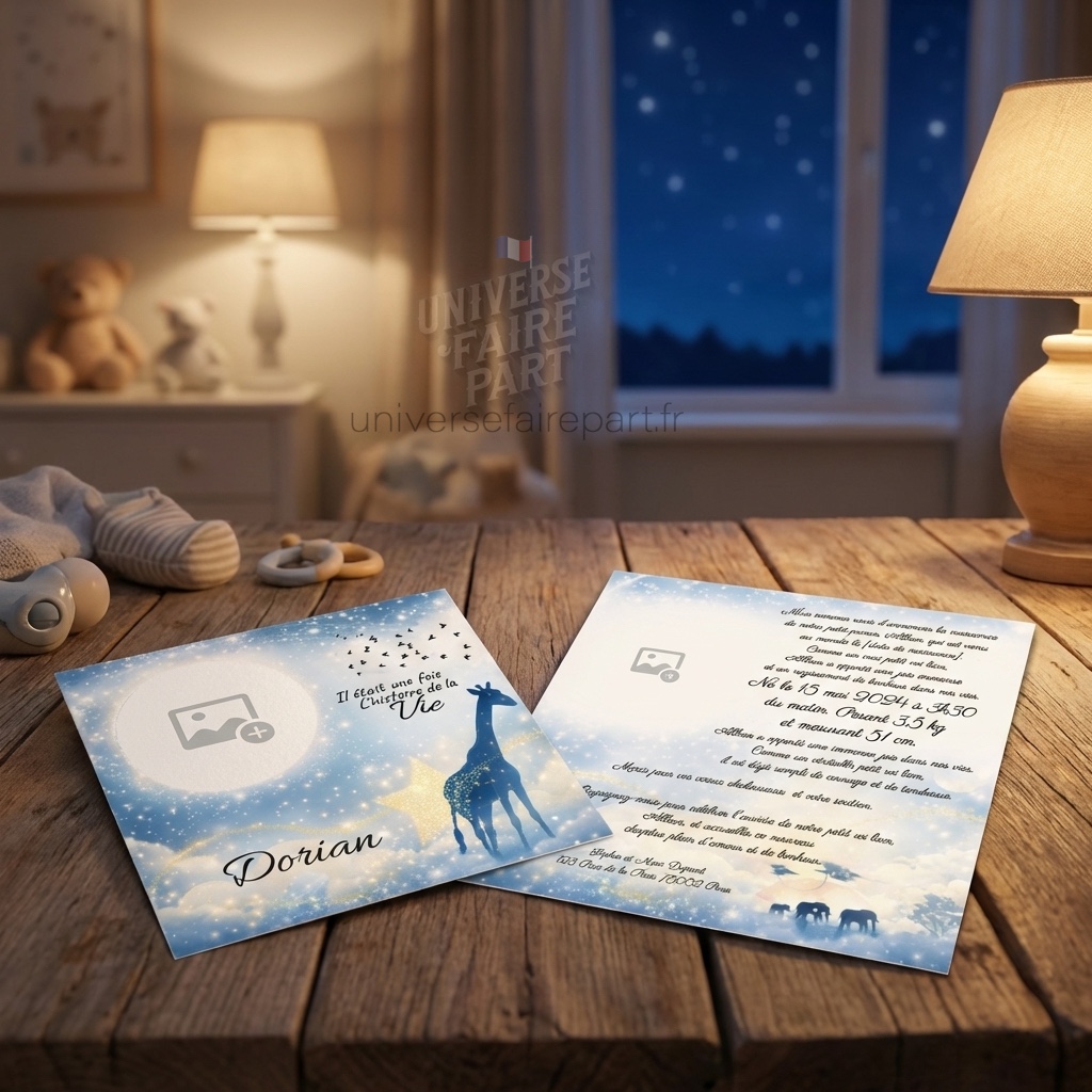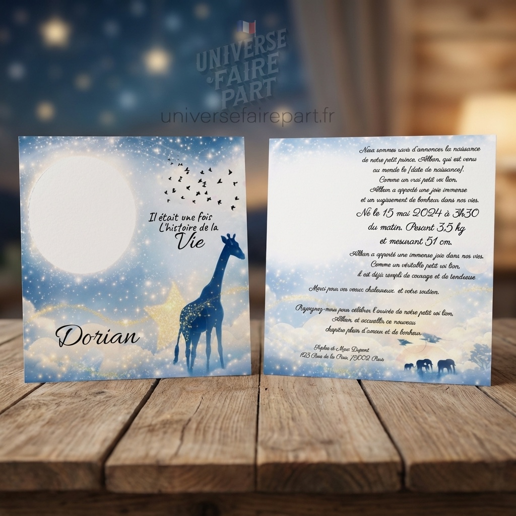 Découvrez notre magnifique faire-part N°335, parfait pour annoncer la naissance ou célébrer un événement spécial pour votre enfant avec le thème Roi Lion, savane, et girafe en bleu roi.