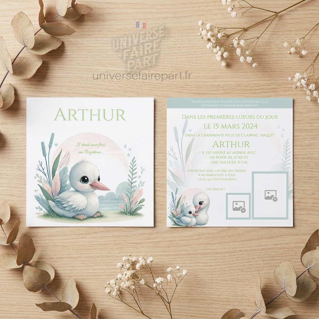 Plongez dans un monde de douceur et de délicatesse avec notre faire-part « L’amour est à plume pastel pélican » ! Imaginez-vous voguer sur les doux courants de l’amour et de la tendresse alors que vous annoncez l’arrivée de votre petit trésor dans ce monde merveilleux.