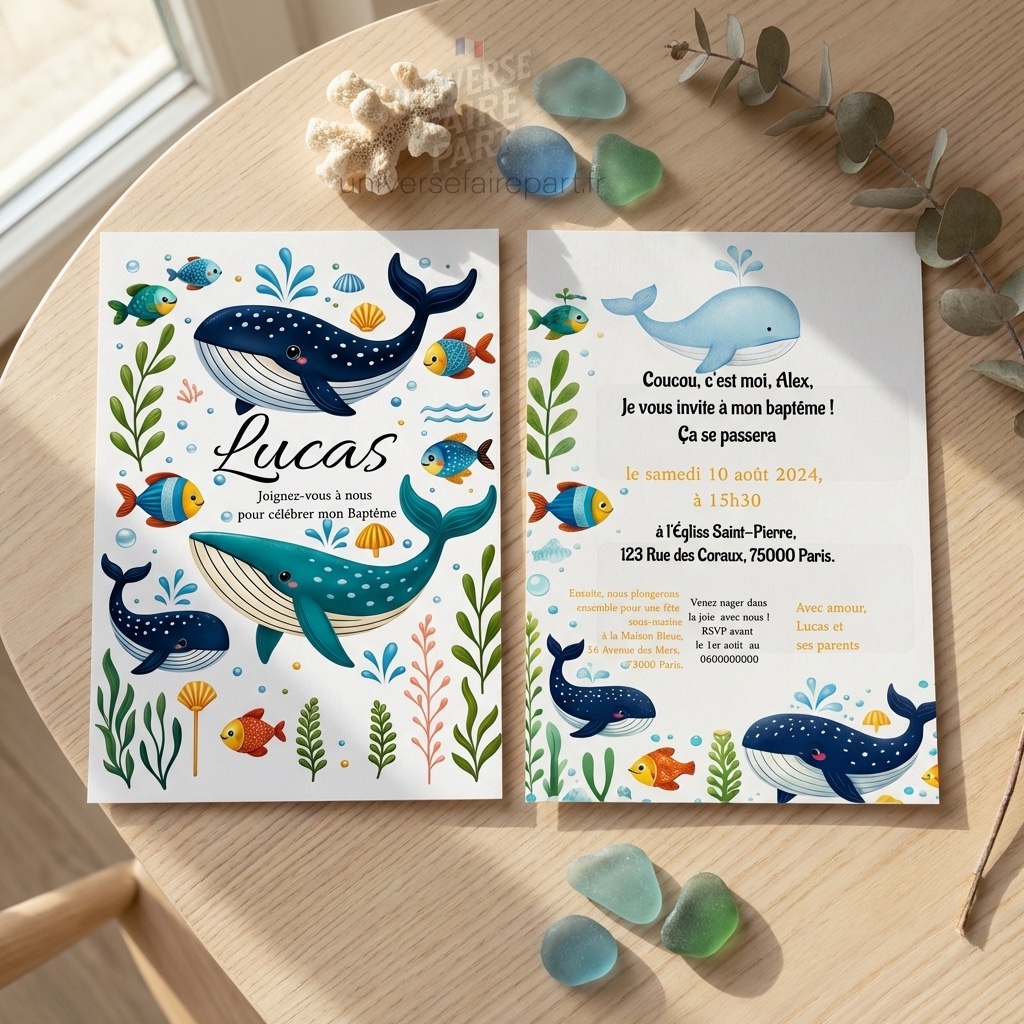 N°558 – Faire-part Plongez dans le Fun ! Invitation à une fête sous-marine Baleine