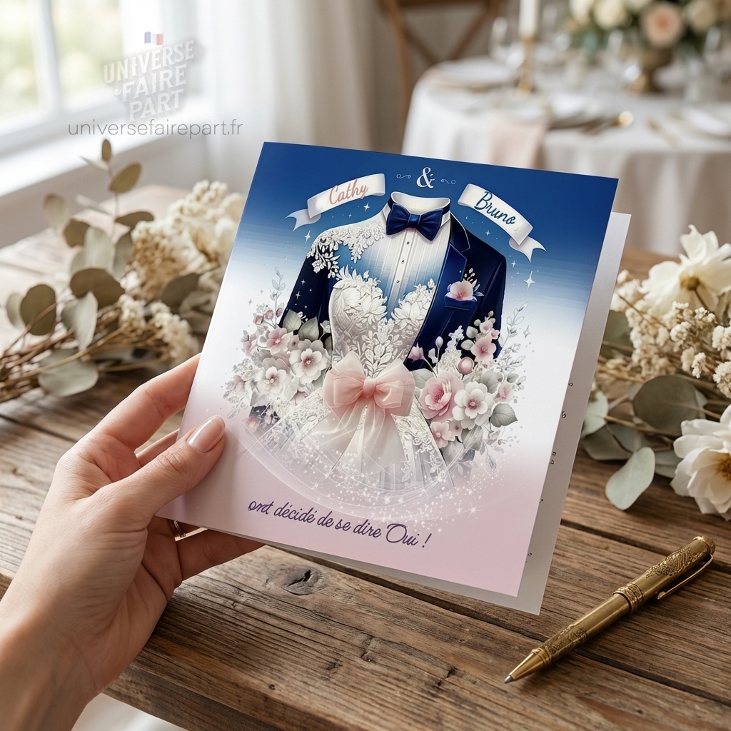 À la frontière entre tradition et modernité, cet invitation est le reflet parfait de votre bonheur à partager. Le bleu roi, couleur de la royauté et de la fidélité, confère à cette création un caractère noble et une harmonie visuelle inoubliable. Les détails délicats, inspirés de la haute couture, apportent une dimension à la fois romantique et contemporaine.