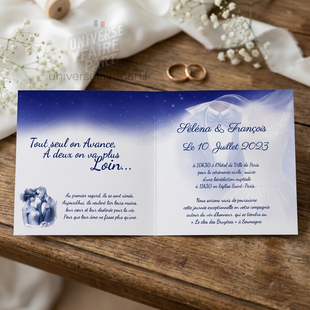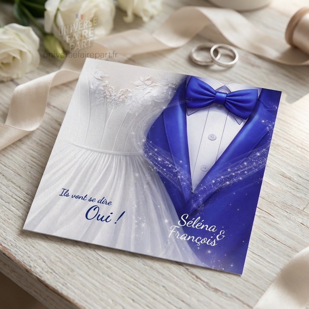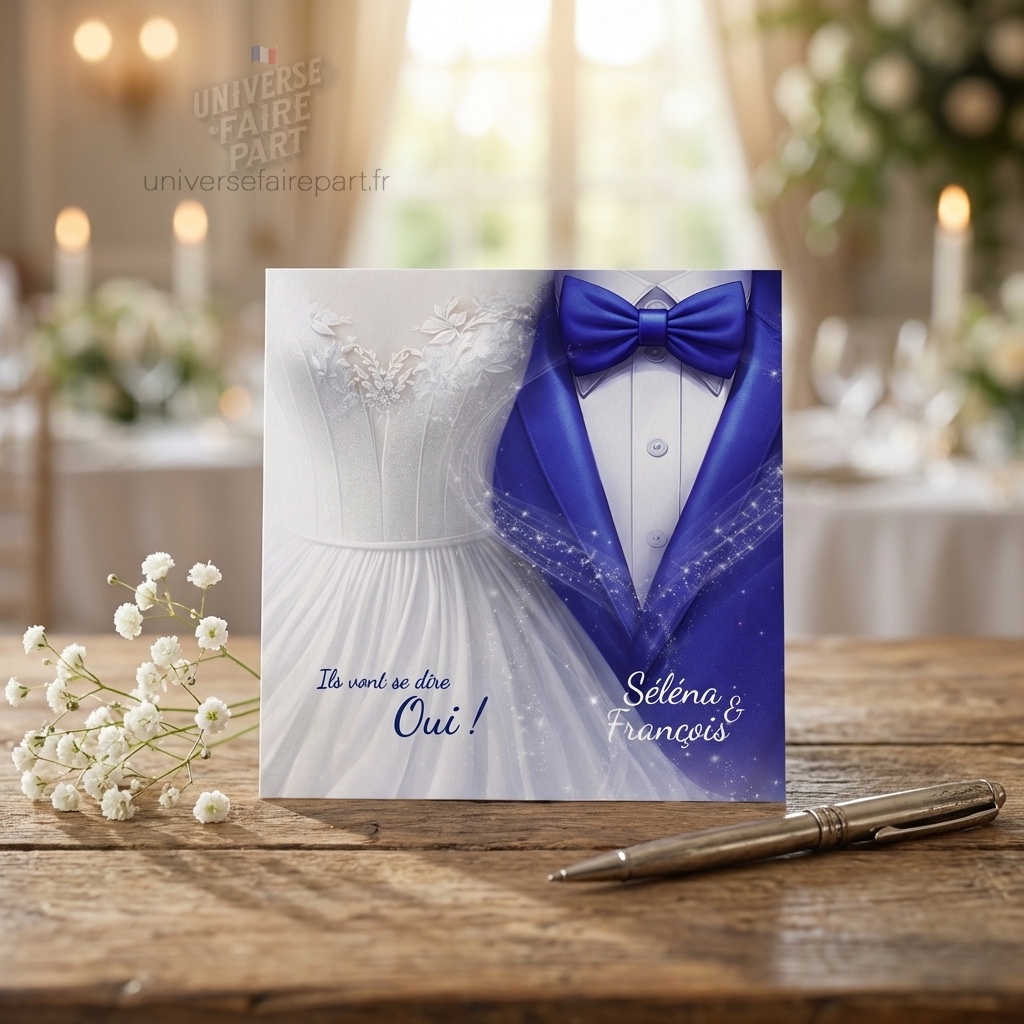 À la frontière entre tradition et modernité, cet invitation est le reflet parfait de votre bonheur à partager. Le bleu roi, couleur de la royauté et de la fidélité, confère à cette création un caractère noble et une harmonie visuelle inoubliable. Les détails délicats, inspirés de la haute couture, apportent une dimension à la fois romantique et contemporaine.