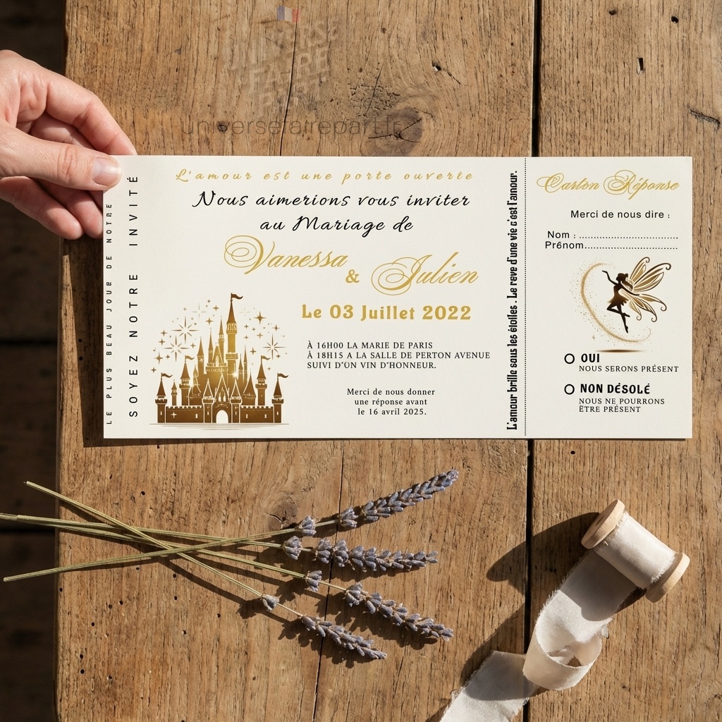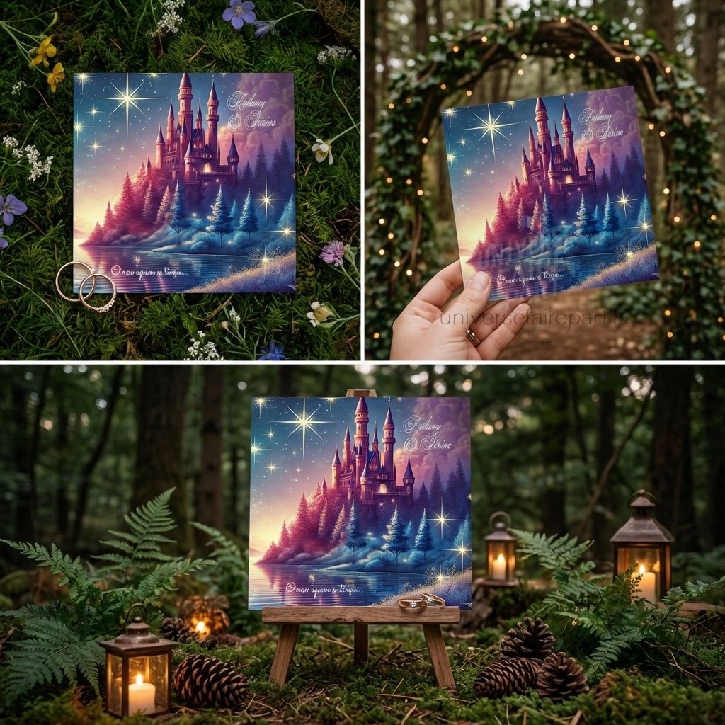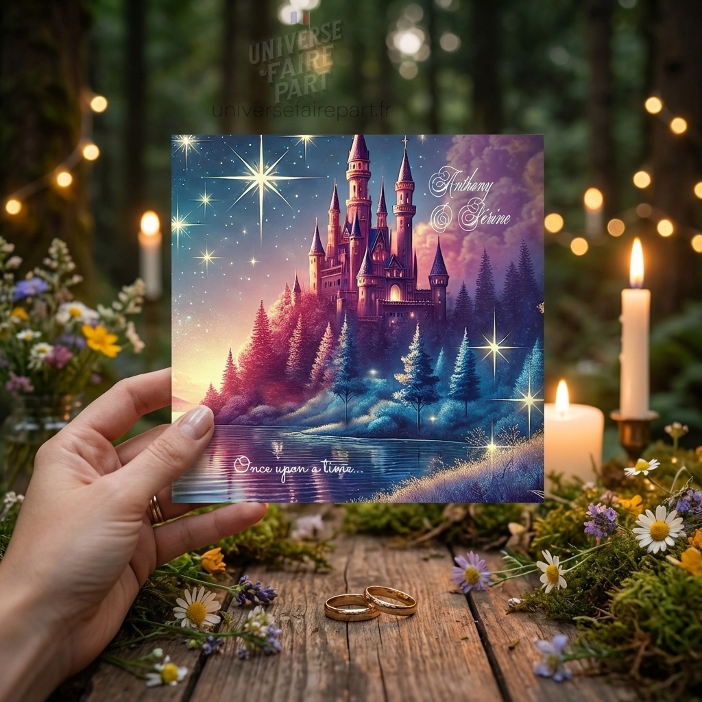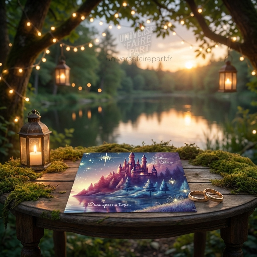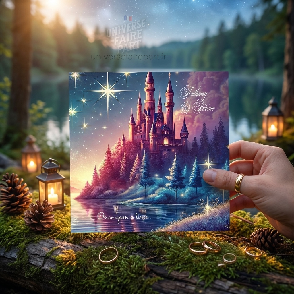 Mots-clés : faire-part mariage, château, conte de fées, événement magique, romantique, personnalisé, rêve, enchanté, France