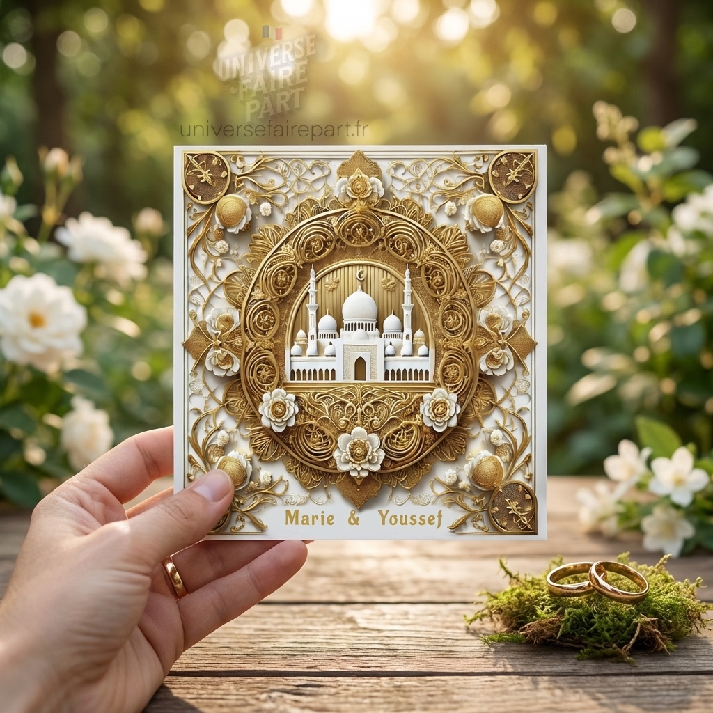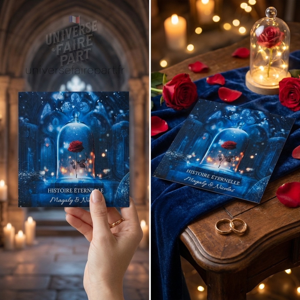 Chaque détail de ce faire-part évoque un rêve, de la rose enchantée sous cloche, symbole d’amour éternel, aux ornements dorés qui encadrent élégamment le texte. Ce modèle est parfait pour les événements où l’amour et la magie se rencontrent pour créer un moment inoubliable.