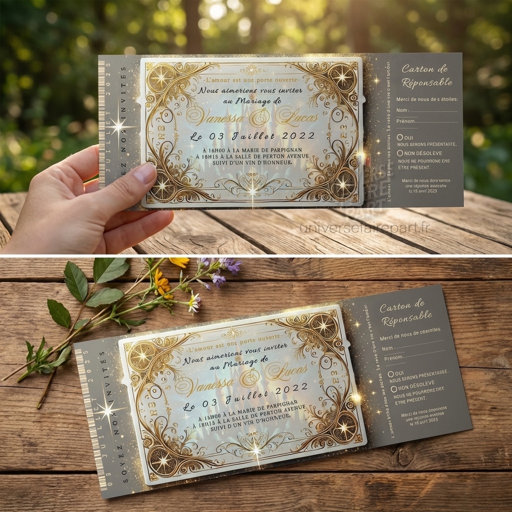 Personnalisation : Ce faire-part peut être entièrement personnalisé pour refléter votre histoire unique. Ajoutez vos prénoms, la date et les détails de votre événement pour que chaque invité se sente plongé dans votre conte de fées.