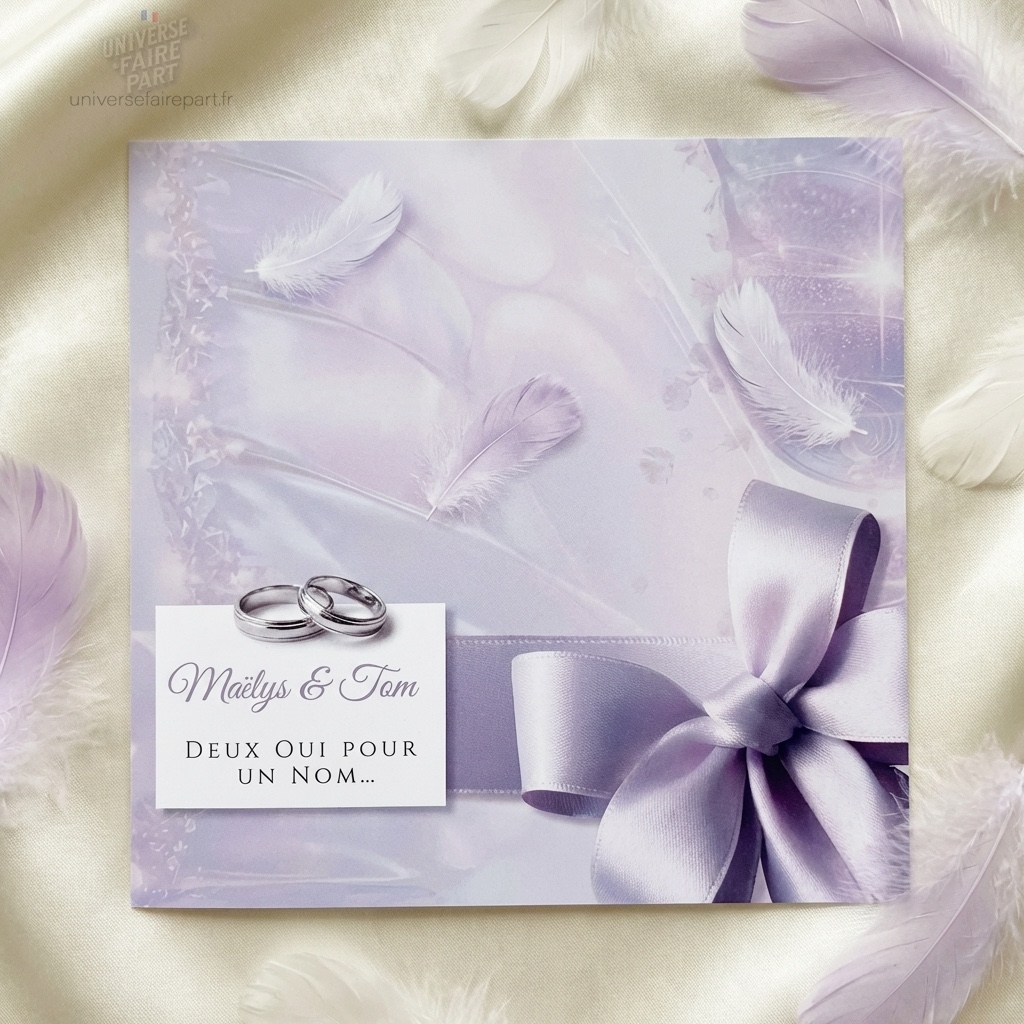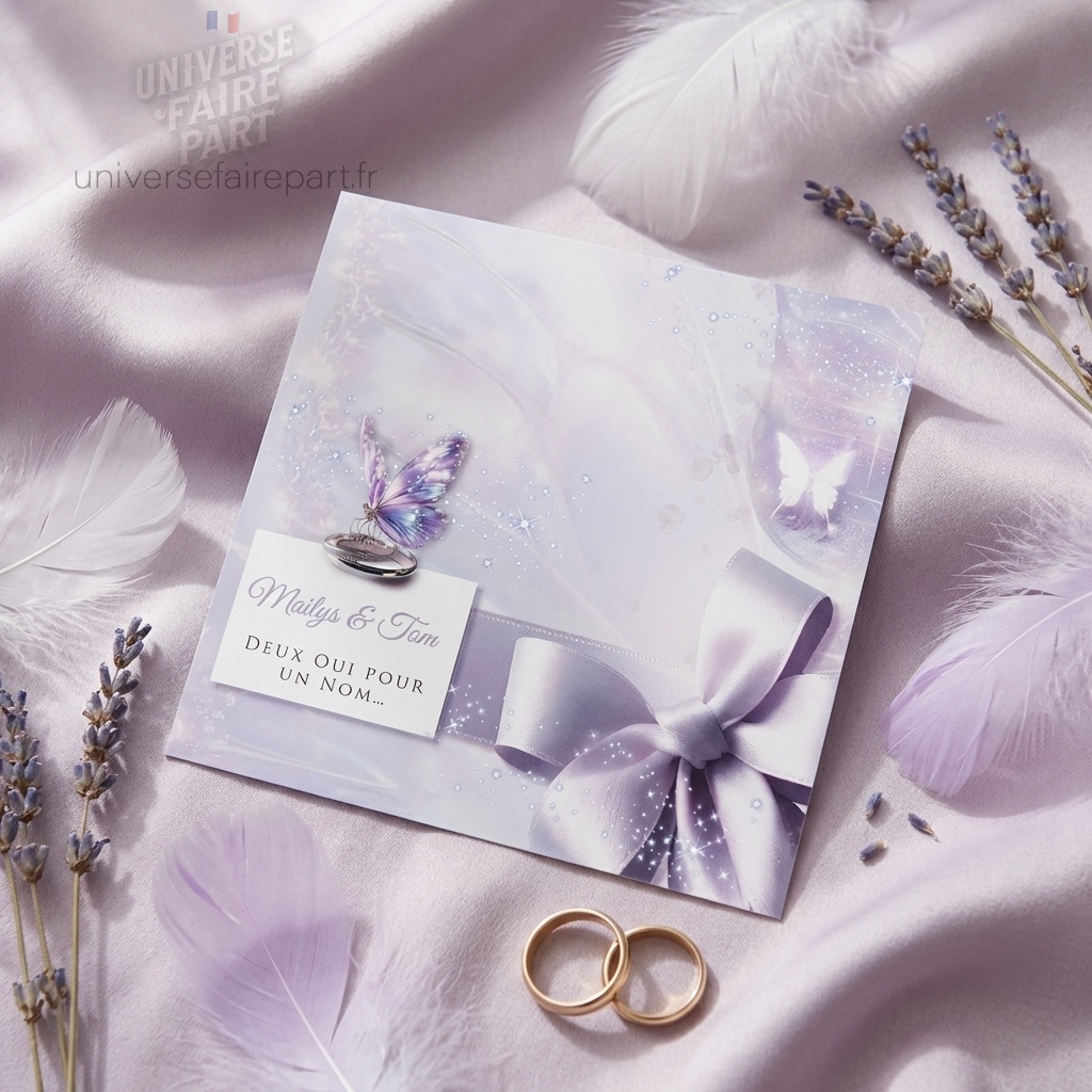 Découvrez l’élégance intemporelle avec notre faire-part « Éclat Enchantés », où la poésie des papillons rencontre la promesse d’un amour éternel. Chaque carte est une œuvre d’art, délicatement conçue pour annoncer votre union de la manière la plus magique. Le jeu subtil des teintes parme s’allie à la douceur du satin et à la brillance délicate des ailes diaphanes pour créer un effet féerique.