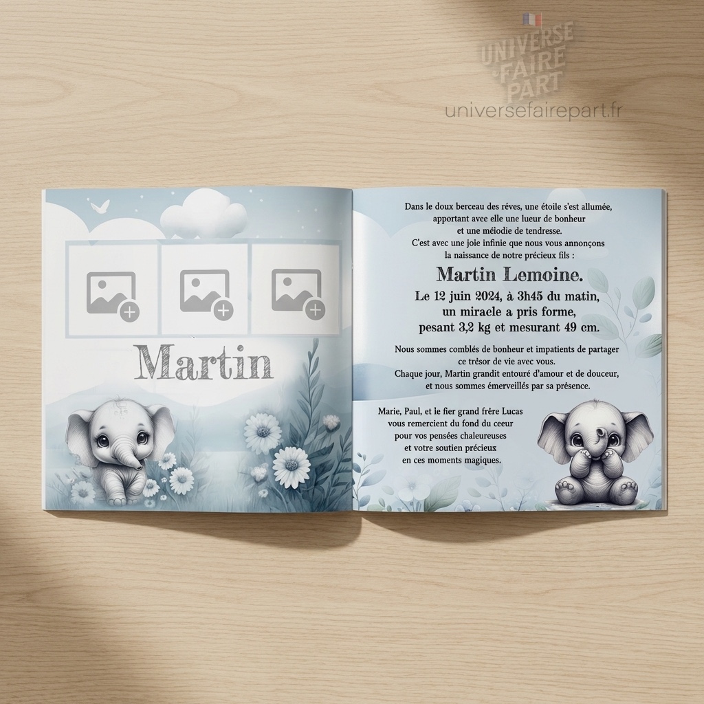 - Personnalisation : Intégrez les informations essentielles telles que le nom, la date et l’heure de naissance, le poids et la taille de votre bébé. Ajoutez également des messages personnalisés des parents pour rendre chaque faire-part unique et spécial.