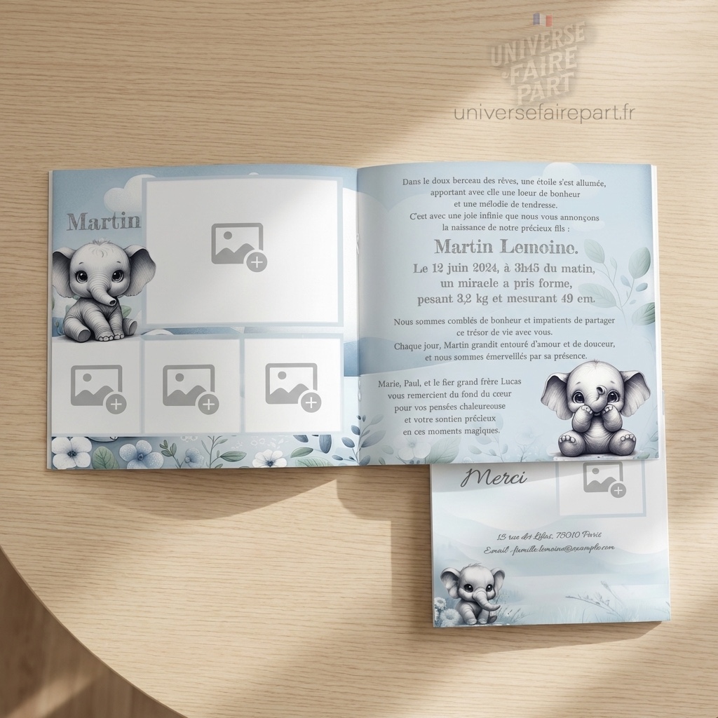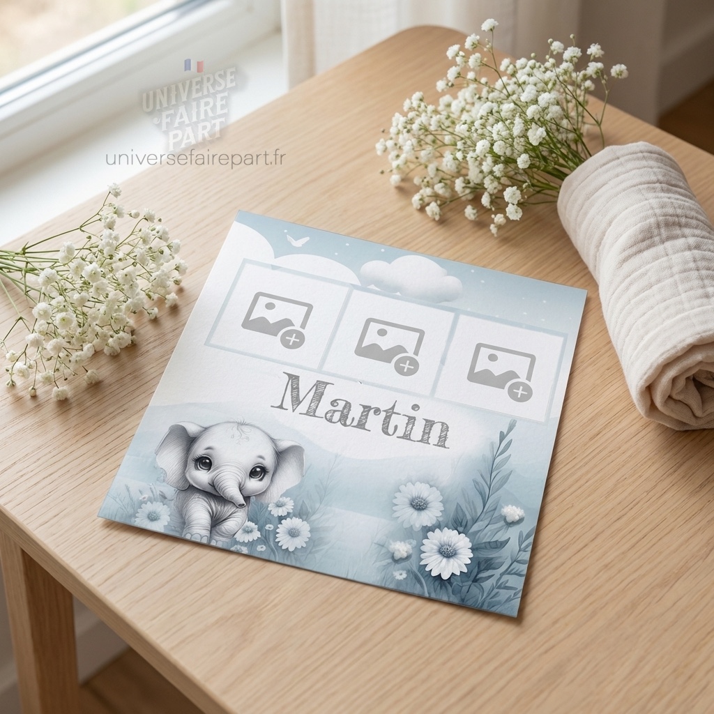 Découvrez notre ravissant faire-part de naissance N°329, magnifiquement conçu pour célébrer l’arrivée de votre petit garçon. Inspiré par le tendre et emblématique éléphant Dumbo, ce faire-part allie douceur et élégance avec ses nuances de bleu et blanc.