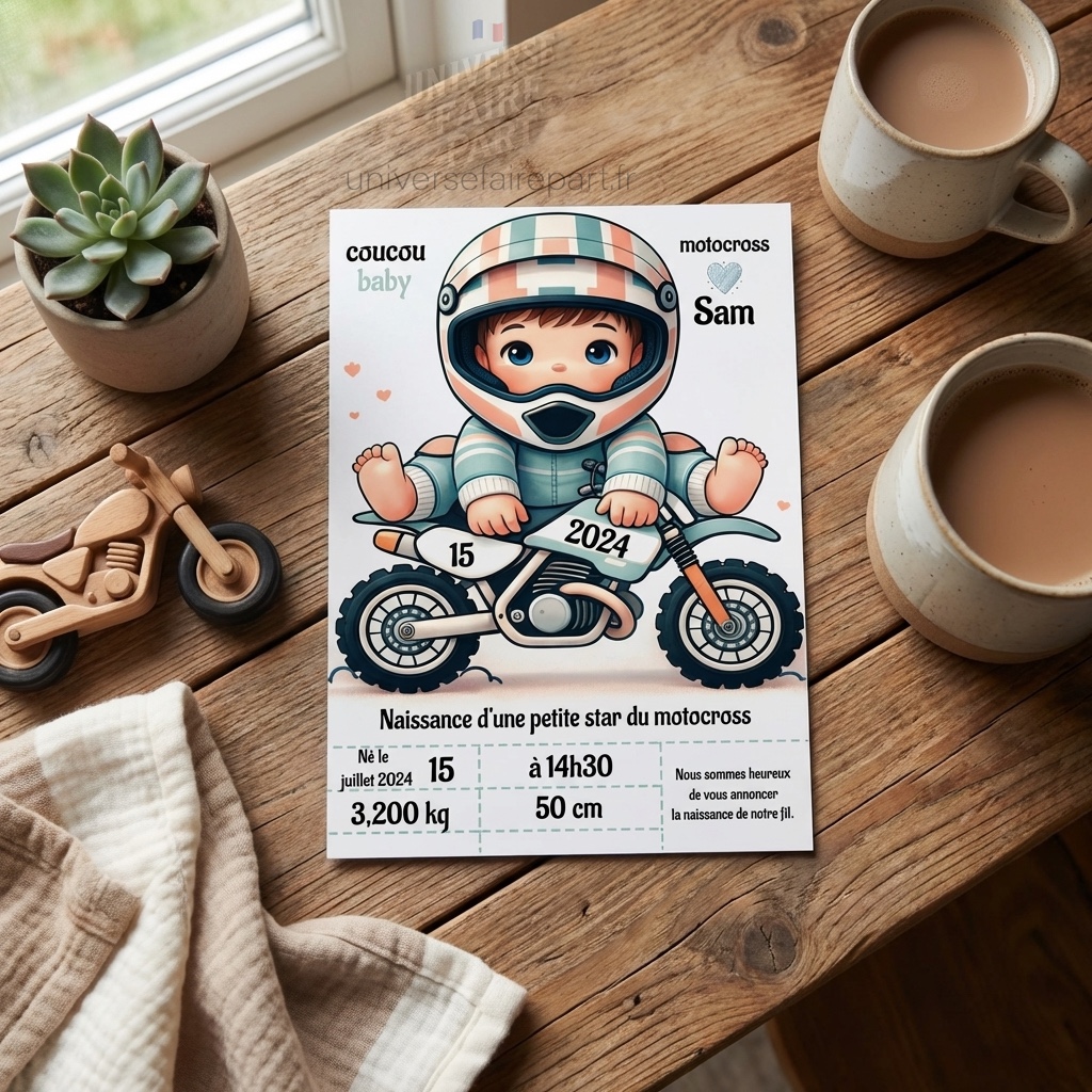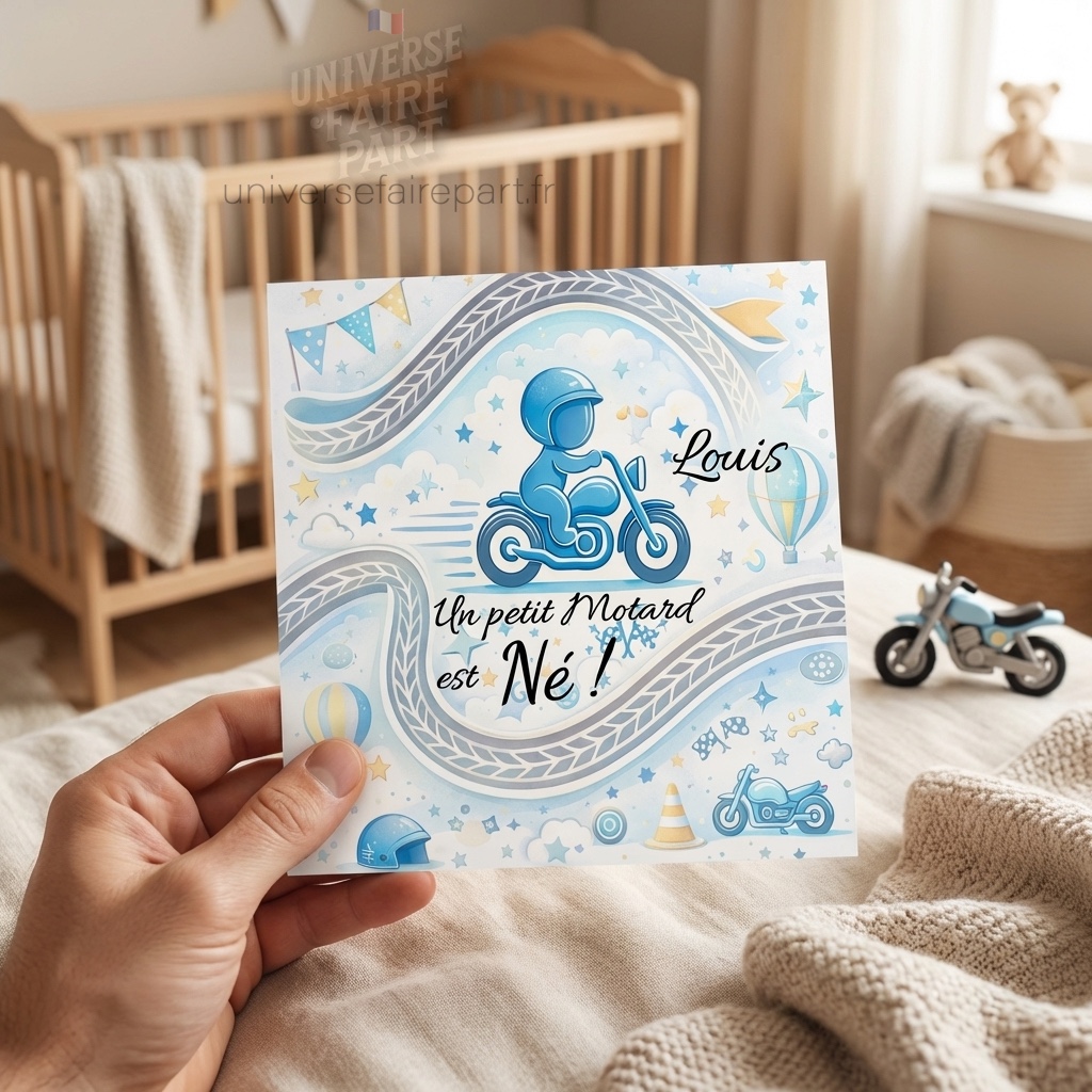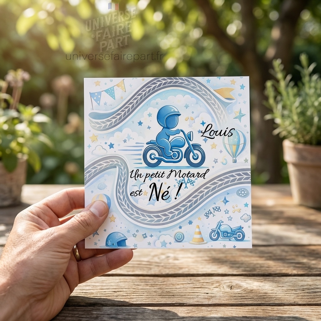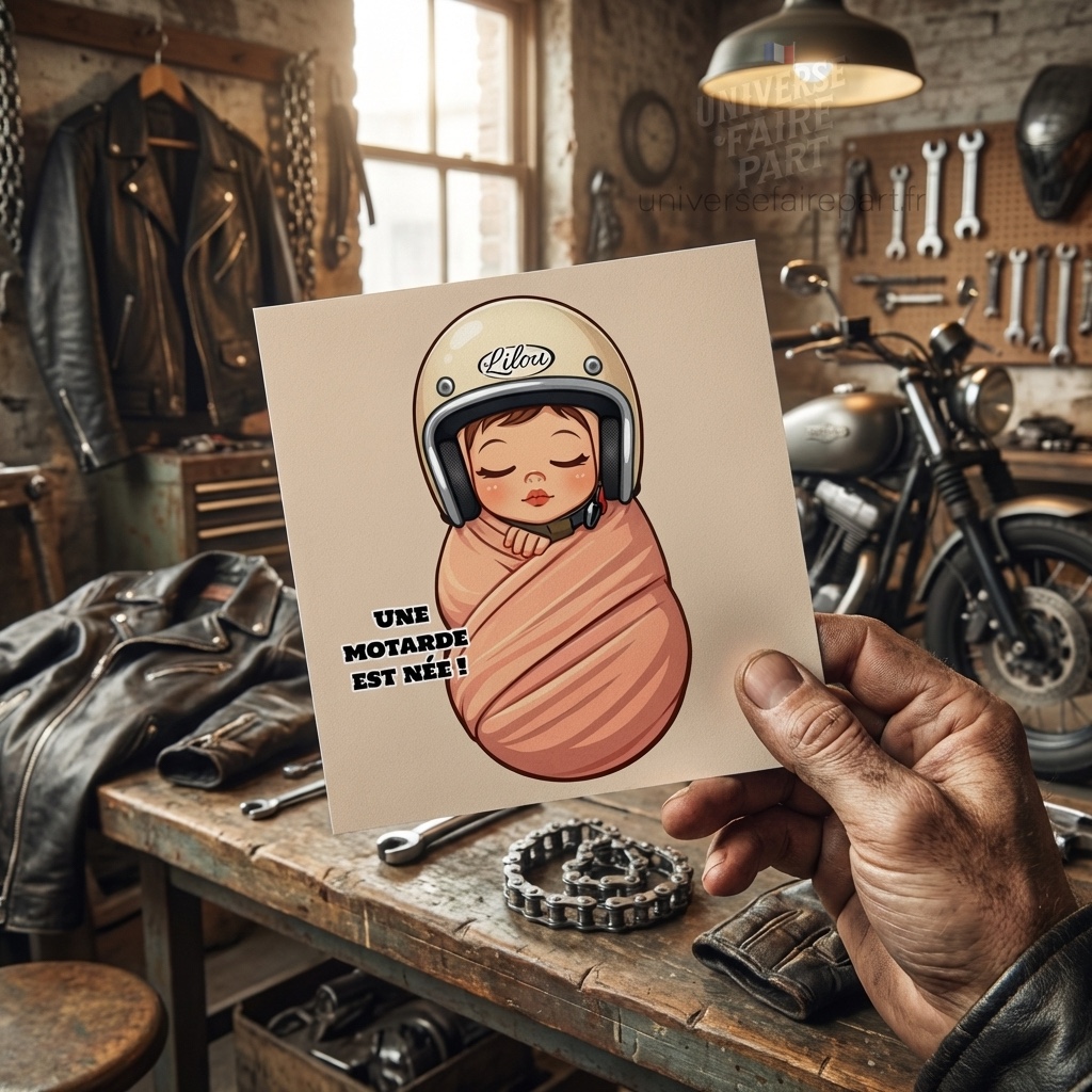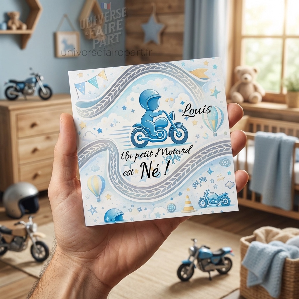 - Thème motard pour une annonce de naissance originale et pleine d’humour.