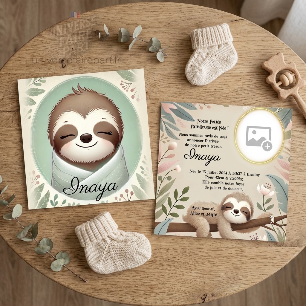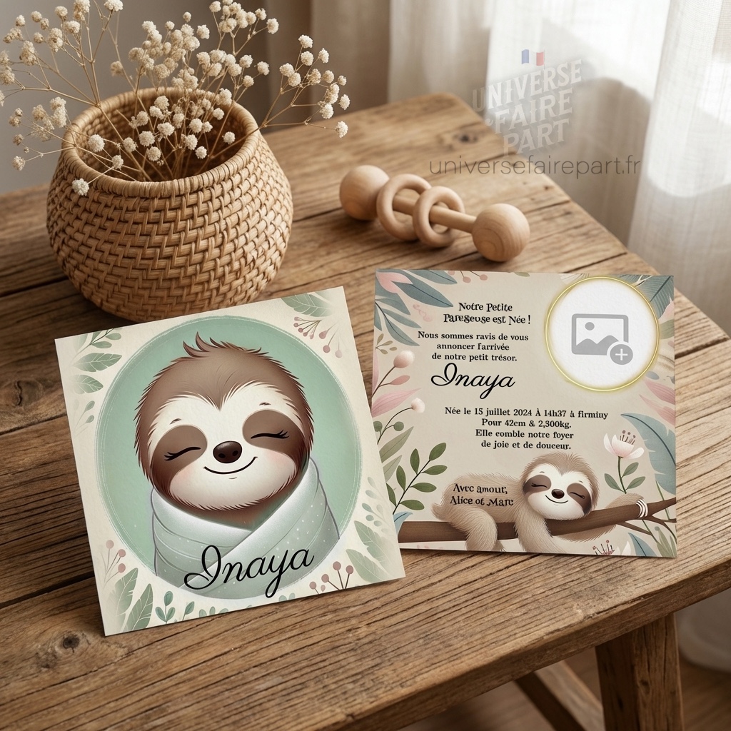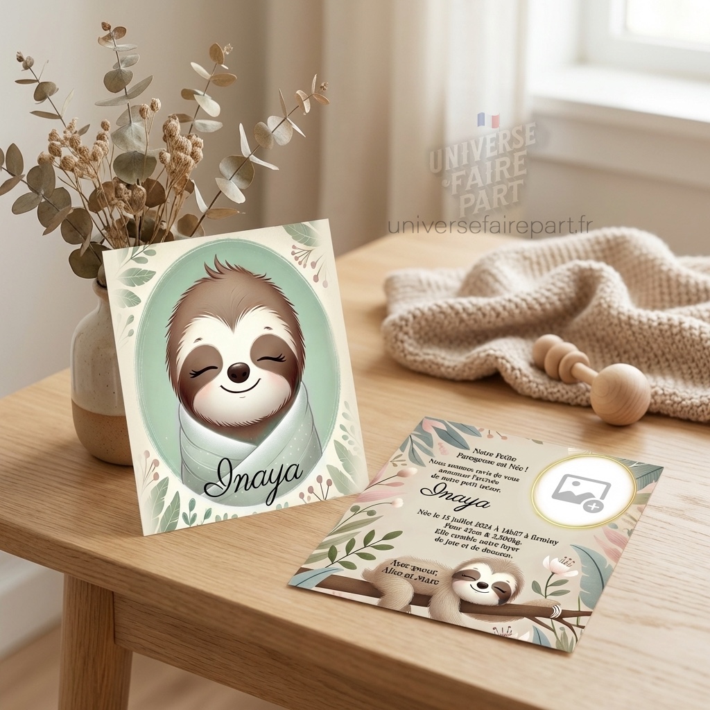 Annoncez la naissance de votre petit trésor avec style et douceur grâce à notre faire-part « Notre Bébé Paresseux a Pointé le Bout de son Nez ». Un souvenir inoubliable pour vous et vos proches.