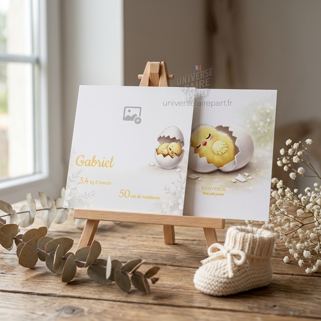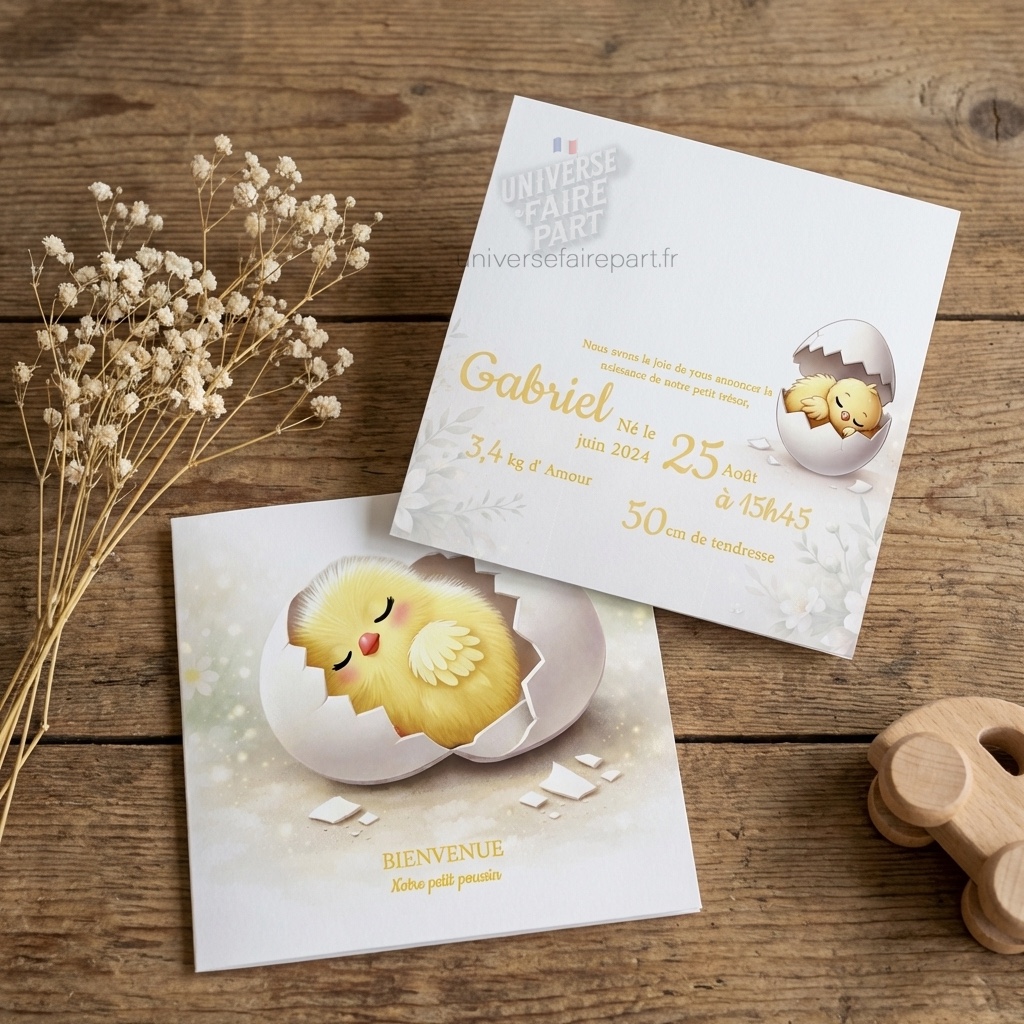 Partagez la joie de cette nouvelle naissance avec ce faire-part charmant et annoncez l’éclosion de votre petit poussin avec amour et style. Commandez dès maintenant et créez un souvenir précieux .