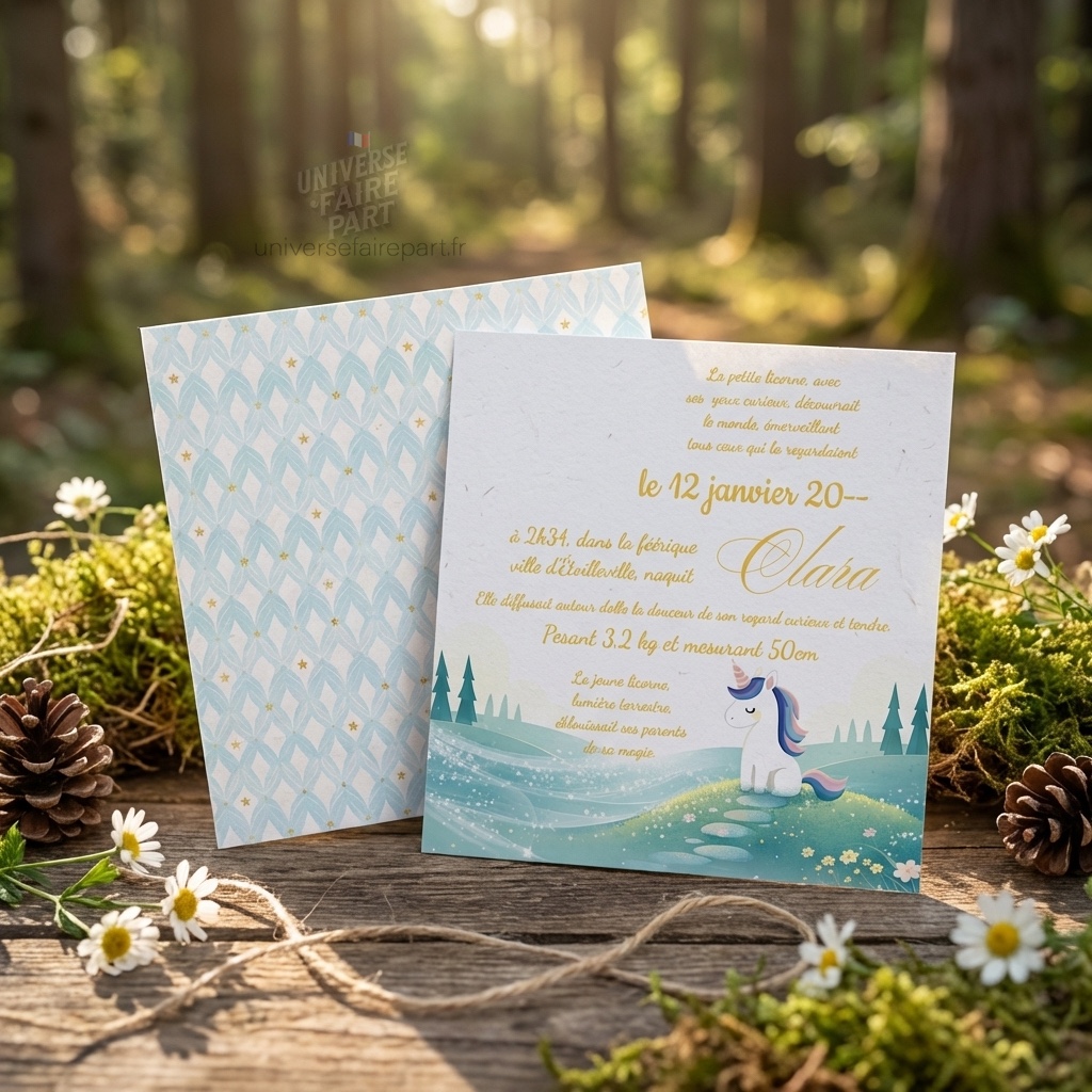Entrez dans un monde de magie et de rêves avec notre faire-part « Licorne Nuit » ! Imaginez-vous flotter dans les doux rayons de la lune alors que vous annoncez l’arrivée de votre petit miracle dans ce monde enchanté.