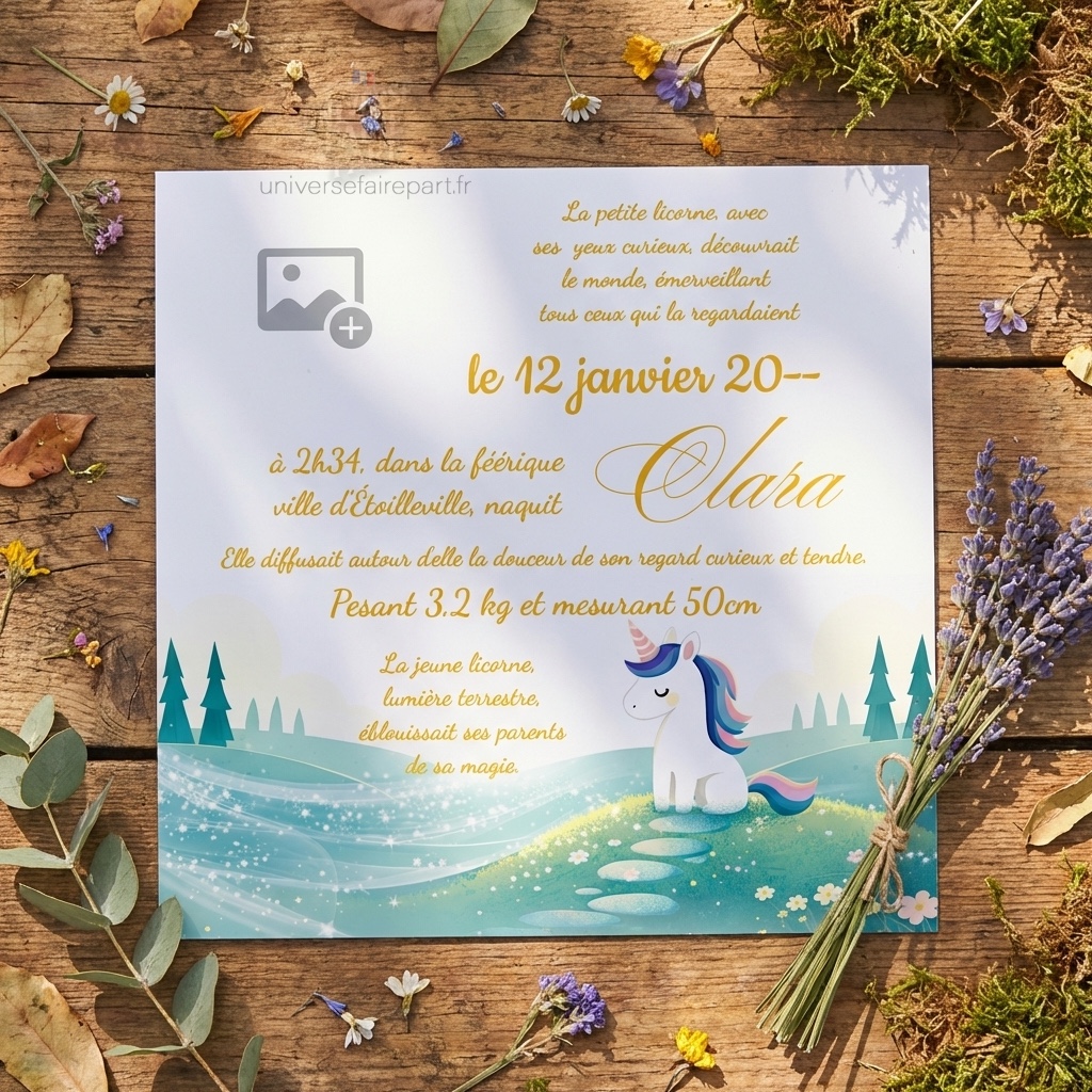 Sous le ciel étoilé de la naissance, notre faire-part capture l’essence de la féérie et de l’émerveillement qui accompagne l’arrivée d’un nouveau membre dans votre famille. Avec ses couleurs vibrantes et ses détails fantastiques, ce faire-part invite vos proches à plonger dans un monde de contes de fées et de doux rêves.