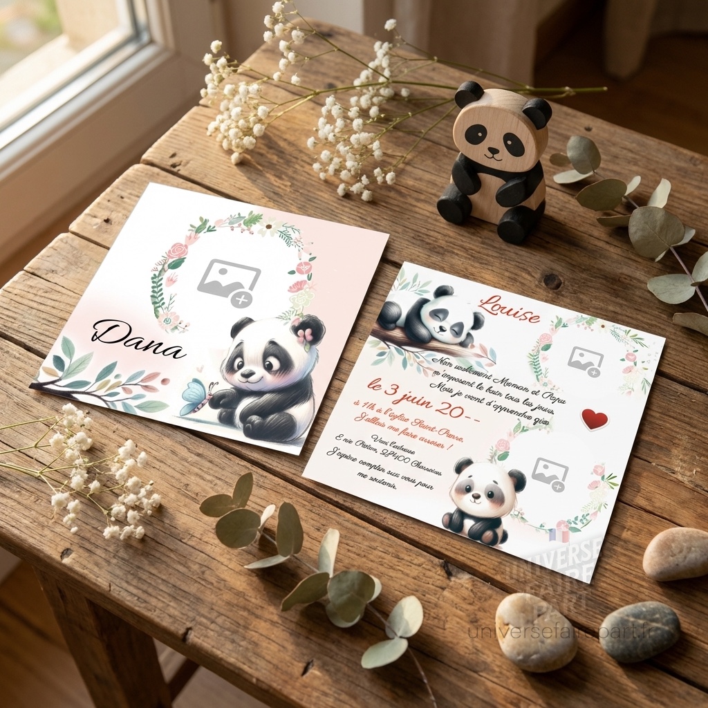 Célébrez l’arrivée de votre petite fille avec notre faire-part ‘Petit Panda Tendre Rosé’, une invitation douce et joyeuse qui encapsule la tendresse de ce moment spécial. Avec son charmant motif de panda et ses touches délicates de rose, ce design est parfait pour annoncer avec douceur et élégance l’arrivée de votre enfant.