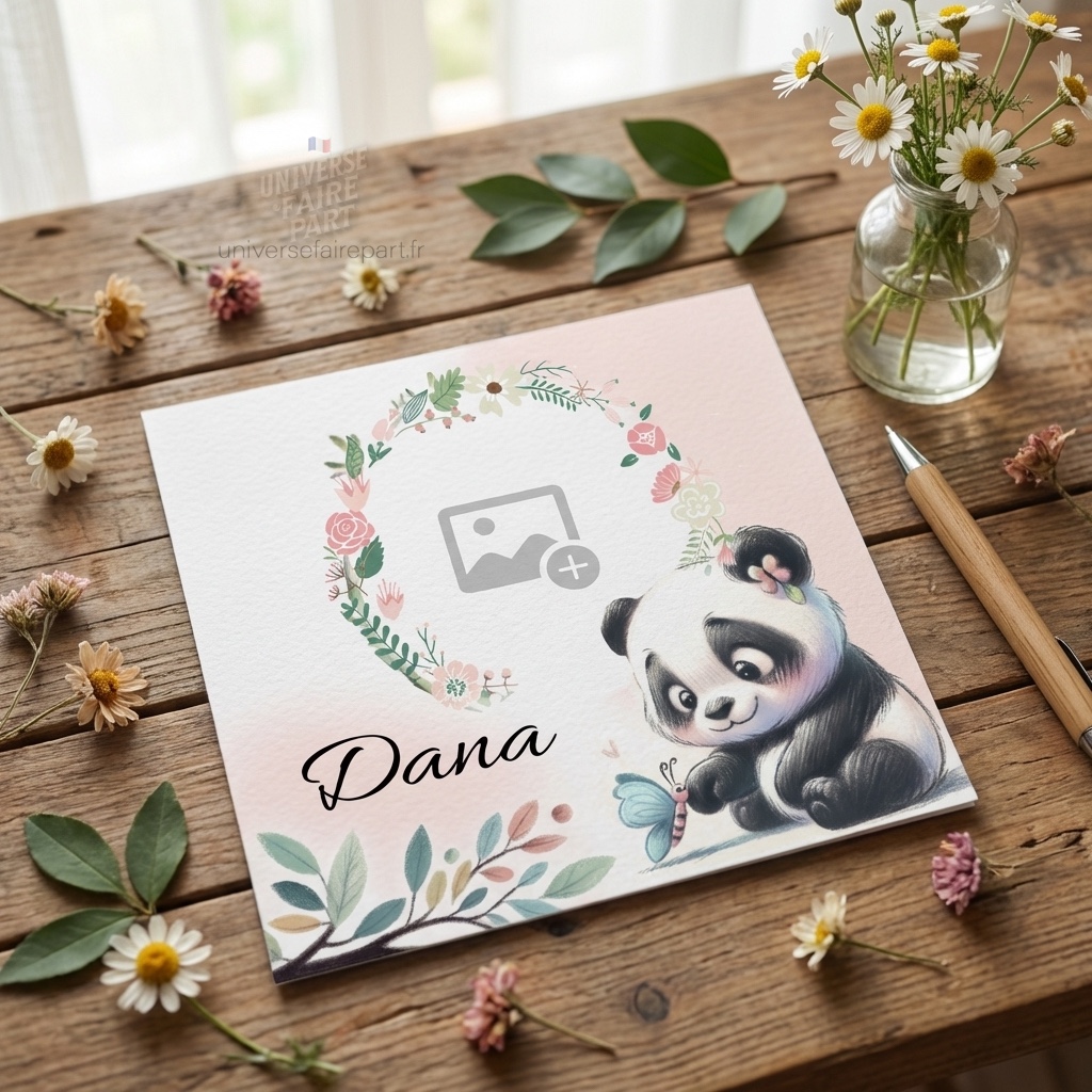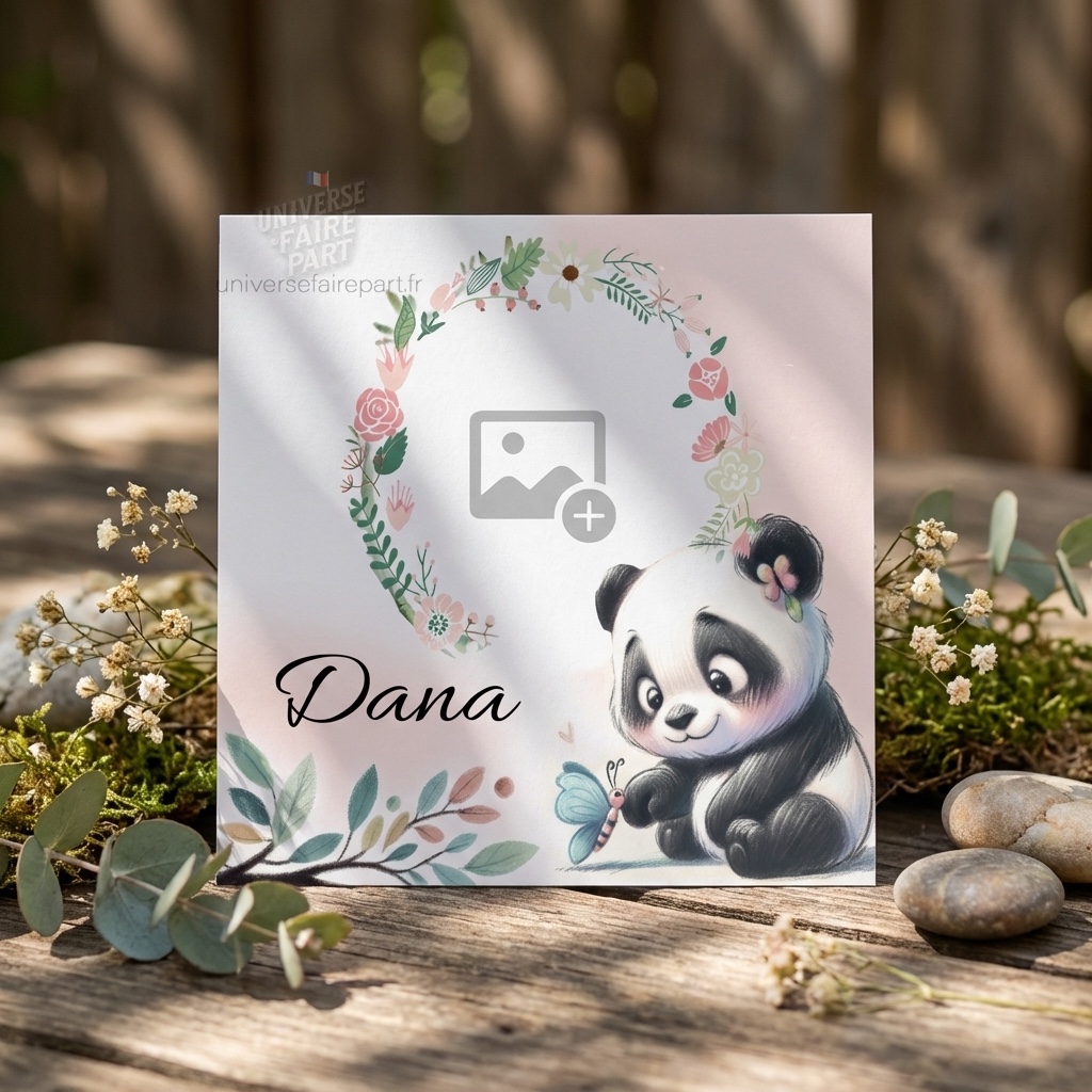 - Illustration : Un adorable panda, symbole de douceur et de protection, accompagné de motifs floraux et de papillons, créant une ambiance sereine et accueillante.