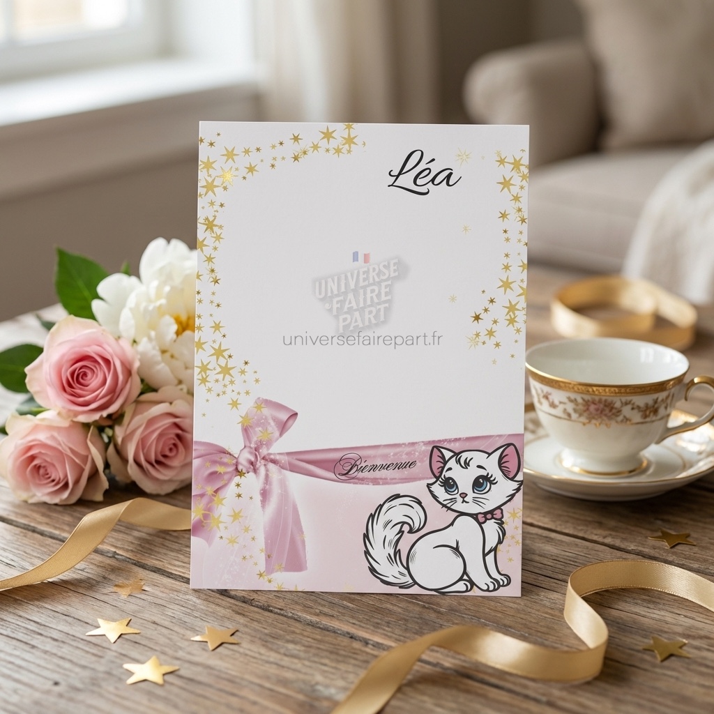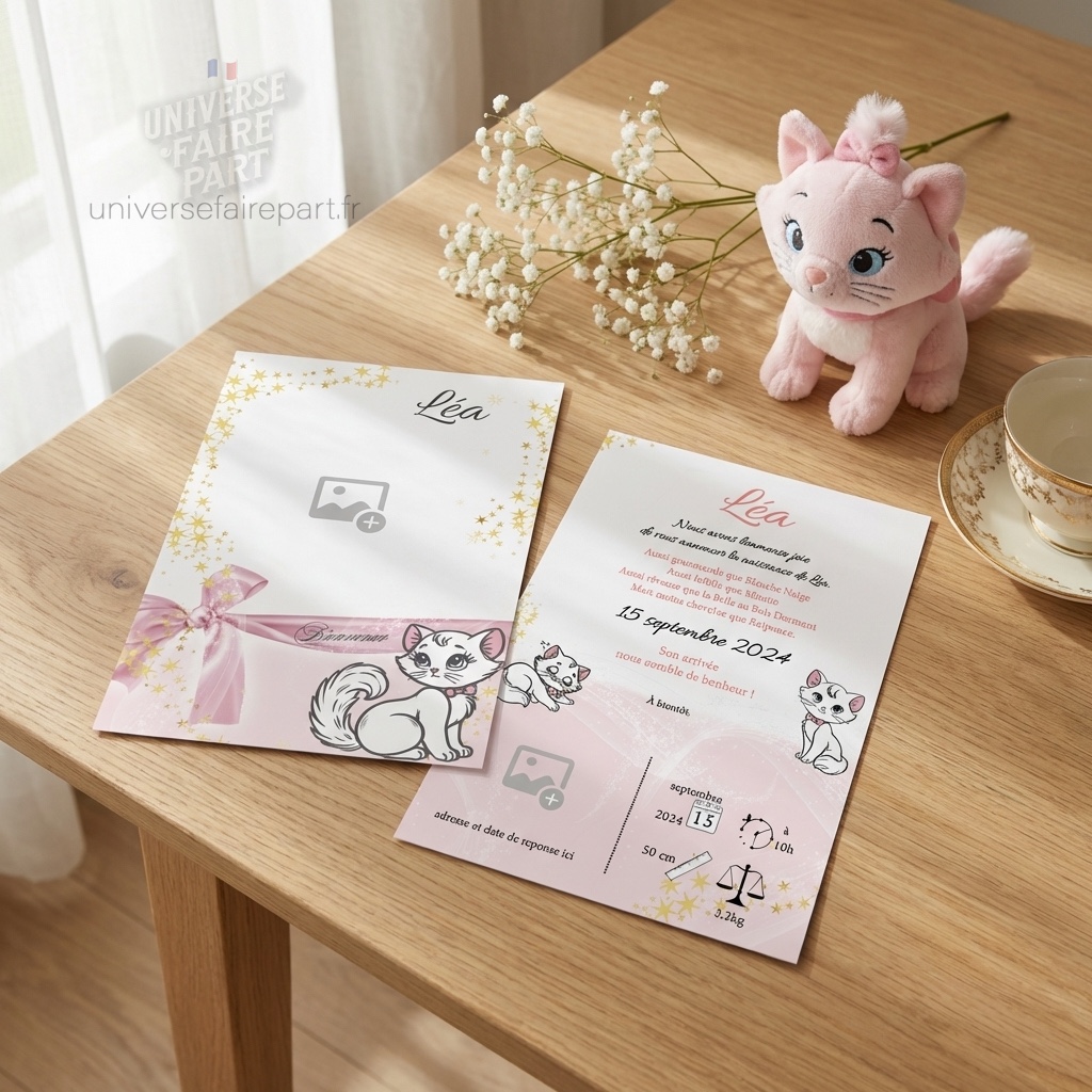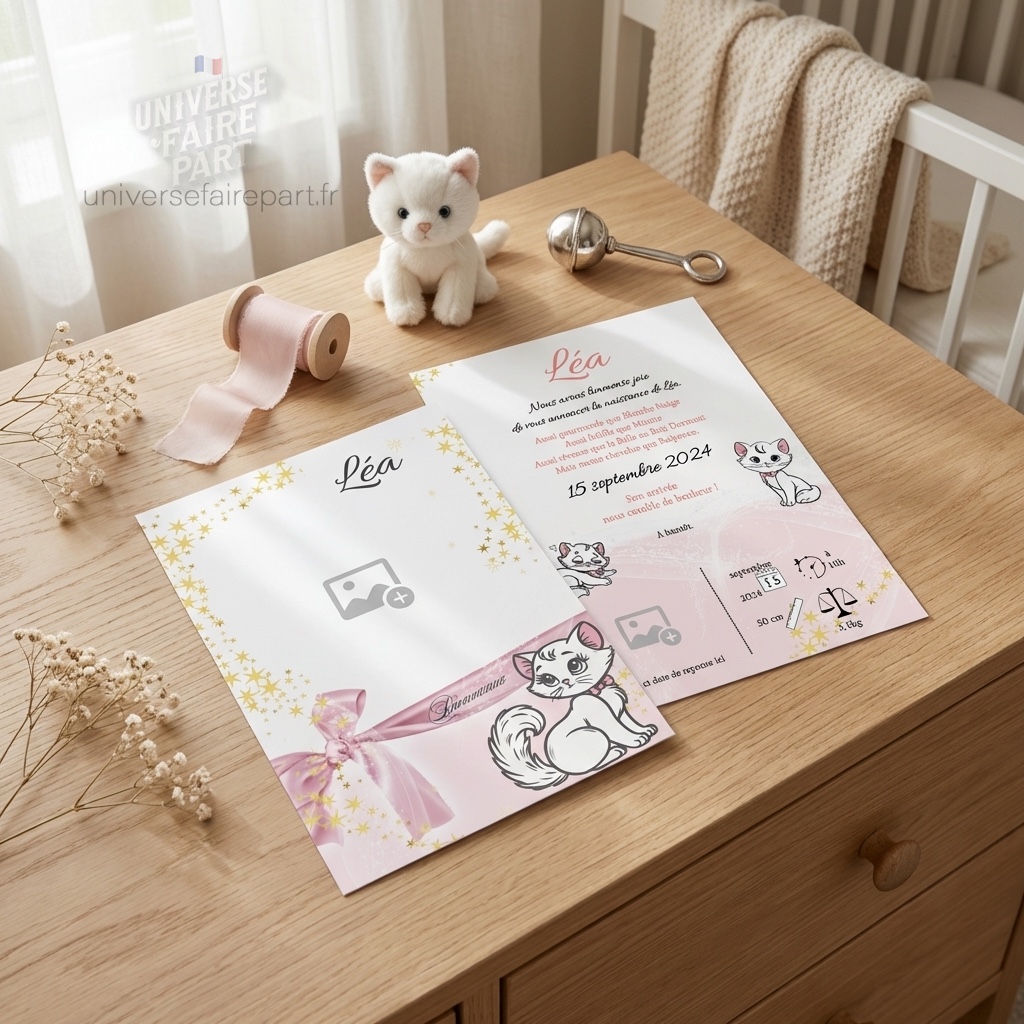 Illustré avec un charmant petit chaton, ce faire-part incarne la douceur et l’innocence de votre bébé. Les illustrations sont réalisées dans des tons pastel doux et apaisants, parfaits pour évoquer l’amour et la tendresse qui entourent la naissance d’un enfant. Le design combine une esthétique moderne et intemporelle, assurant qu’il plaira à tous ceux qui le recevront.