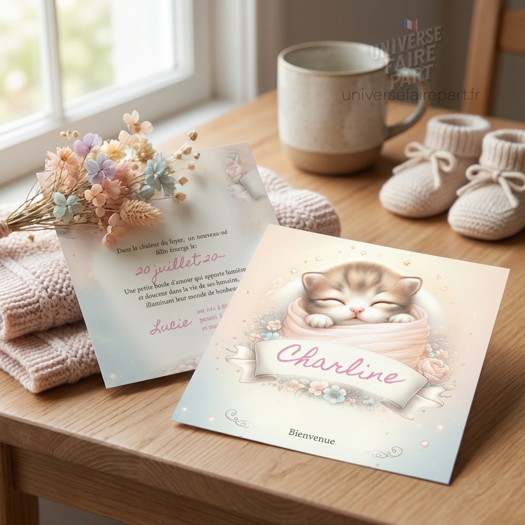mots clés : chaton, coucou, pastel, mignon, fleurs, naissance, baptême, anniversaire, douceur, papeterie