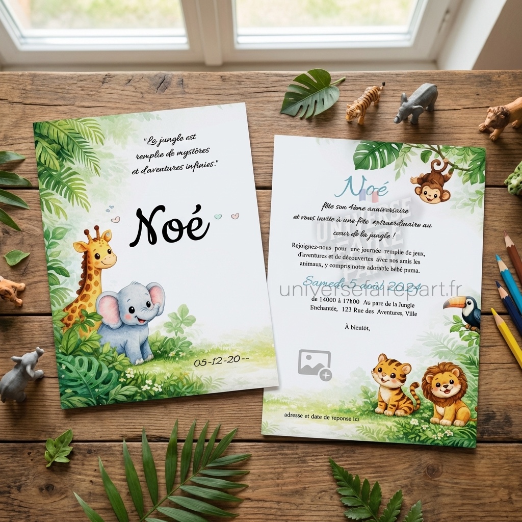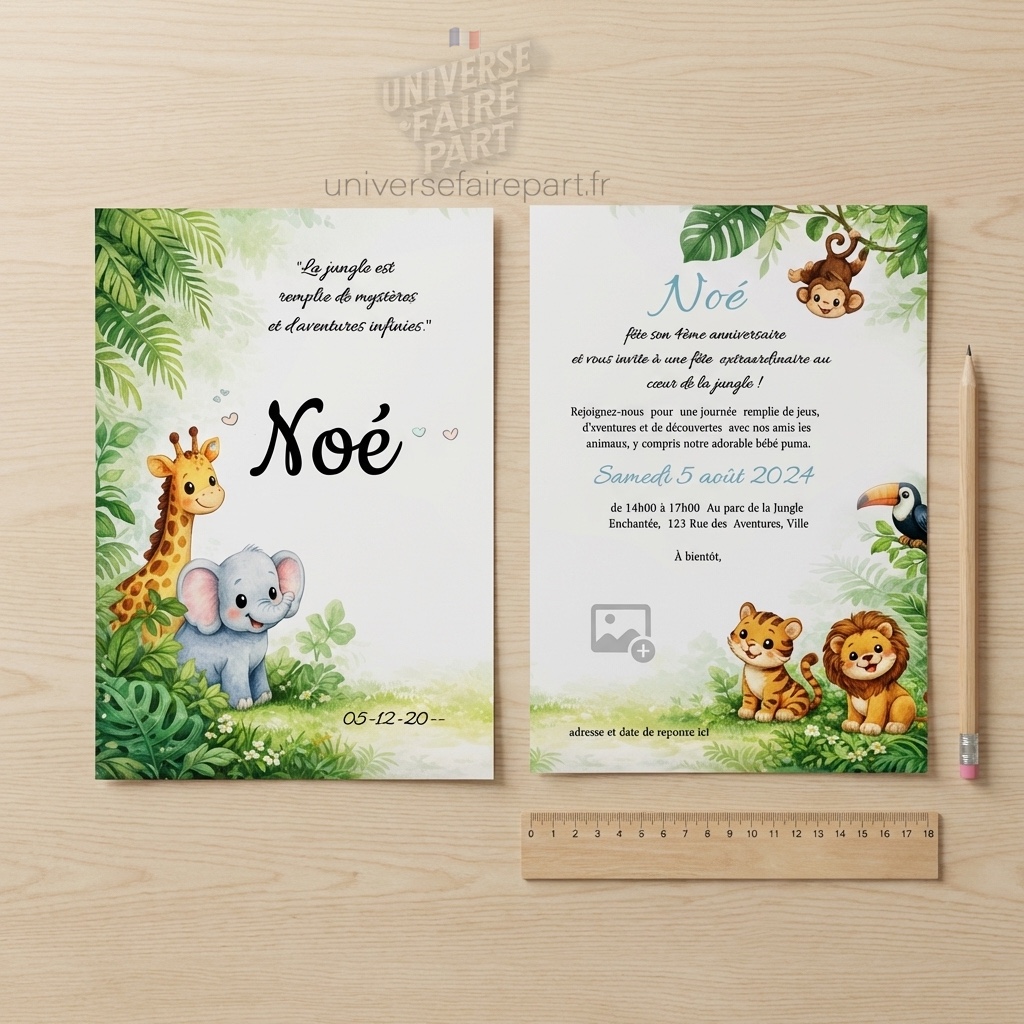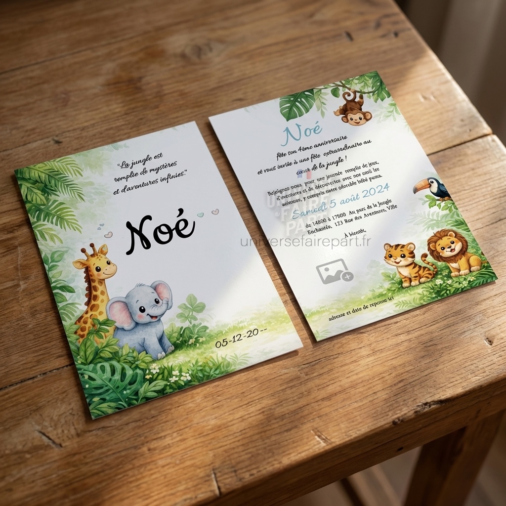 Nous sommes ravis de vous présenter notre nouveau faire-part, une invitation palpitante et exotique pour célébrer une occasion spéciale. Ce faire-part est idéal pour ajouter une touche d’aventure et de mystère à votre événement, capturant l’essence sauvage et fascinante de la jungle.