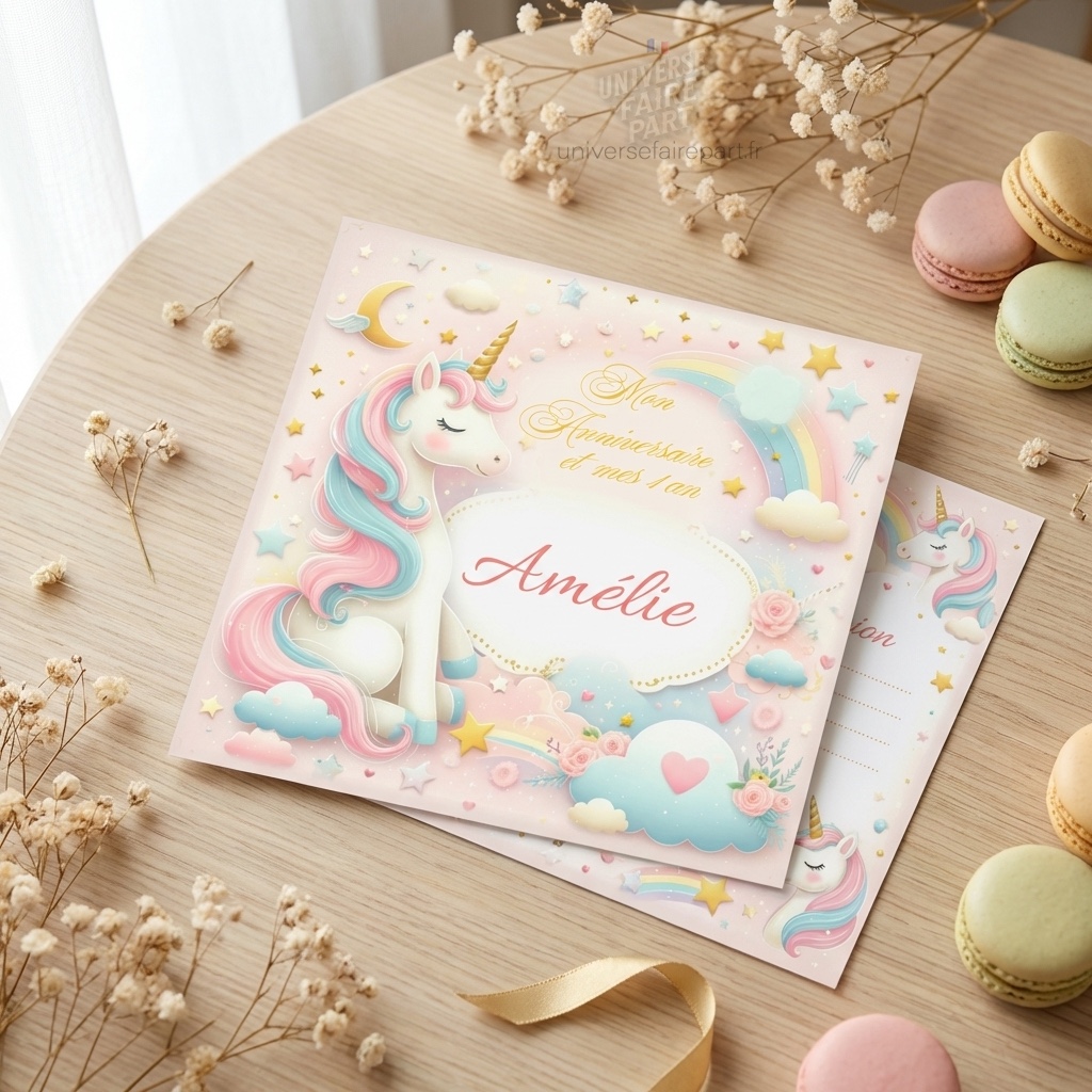 mots clés : anniversaire, 1 an, Amélie, licorne, pastel, arc-en-ciel, étoiles, roses, féérique, papeterie