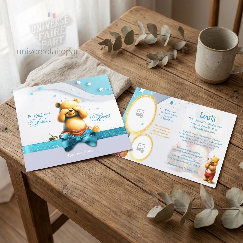 Joignez-vous à Winnie l’ourson pour célébrer ce moment magique avec notre faire-part N°539. Il est l’invitation parfaite à partager votre bonheur et à introduire votre merveilleux garçon au monde qui l’entoure.