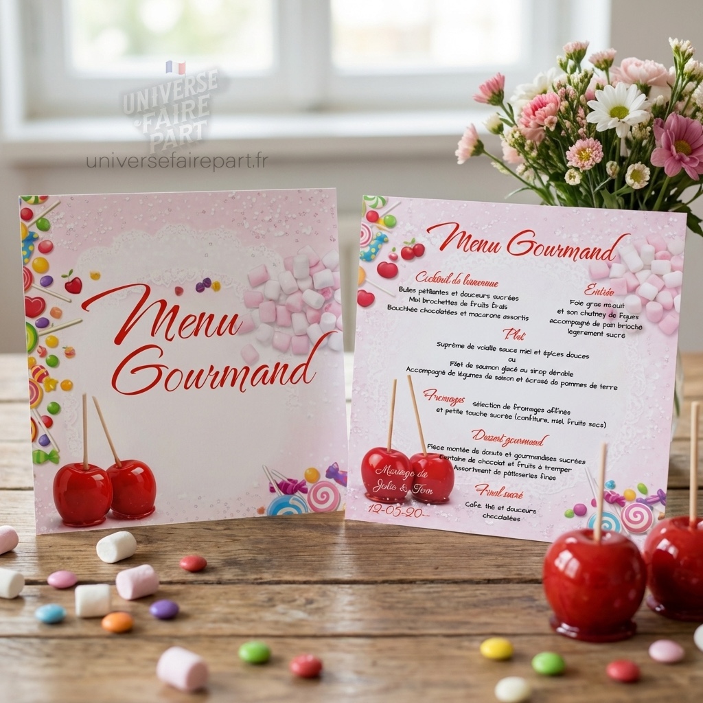 Succombez à une création pleine de douceur et de poésie, inspirée par la célèbre pomme d’amour, symbole de gourmandise et de romantisme. Ce modèle associe élégance et univers sucré dans une harmonie délicate de tons pastel, où chaque détail évoque la fête, le plaisir et l’amour partagé. Les bonbons colorés et les textures légères viennent encadrer avec finesse un espace épuré, idéal pour mettre en valeur votre texte tout en conservant un rendu chic et lumineux.