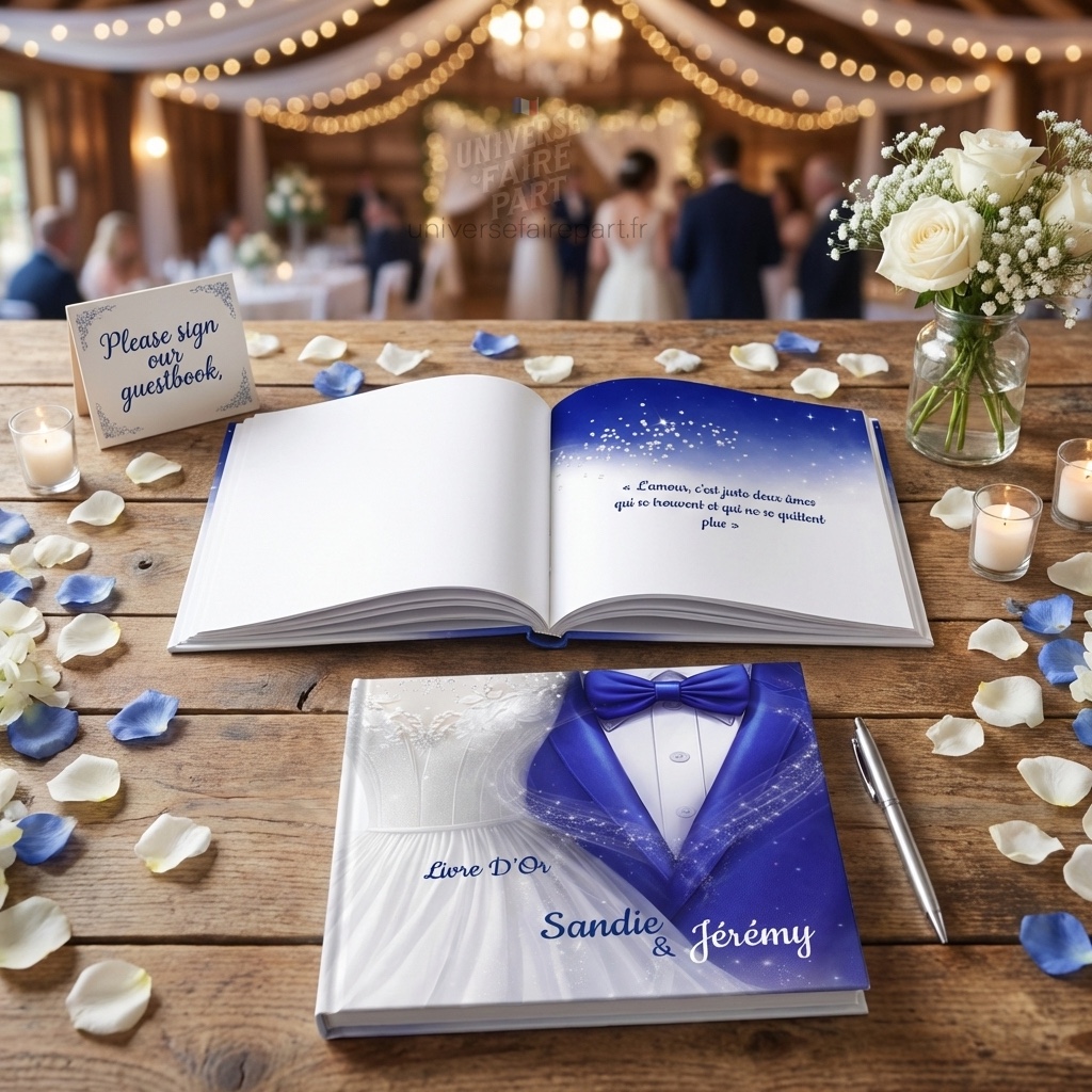 Ce livre d’or raffiné aux couleurs bleu royal et blanc nacré est conçu comme un clin d’œil élégant à la tenue des mariés : la robe de la mariée et le costume du marié se dessinent en couverture dans un éclat d’étoiles, tel un souvenir magique suspendu dans le temps.