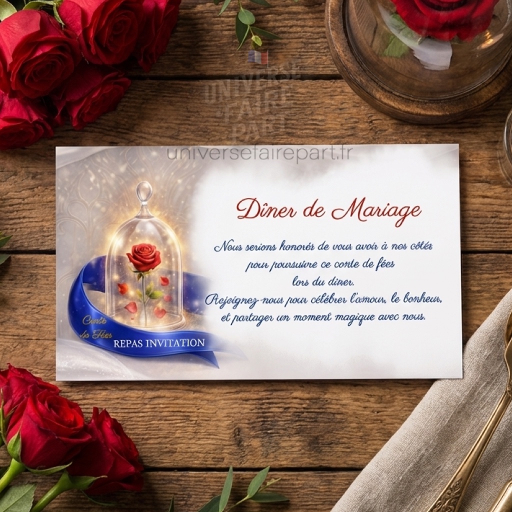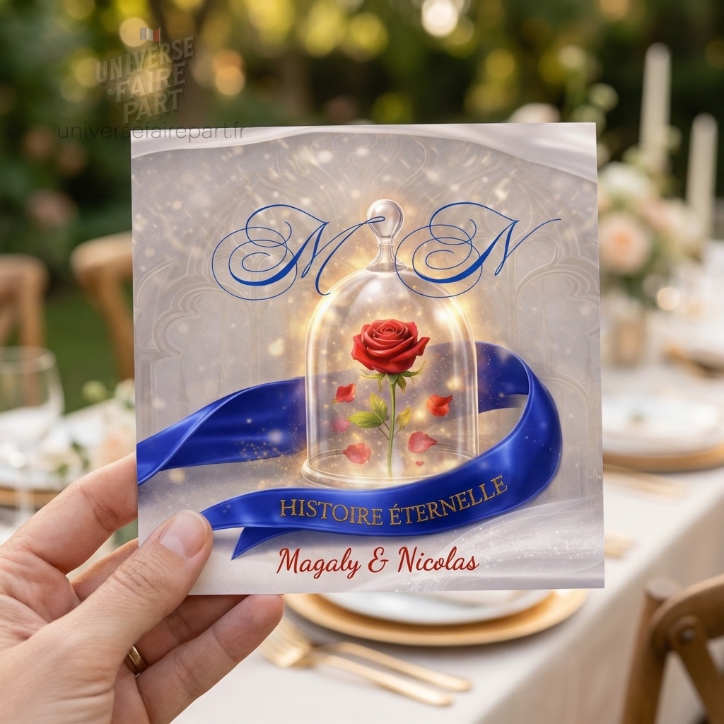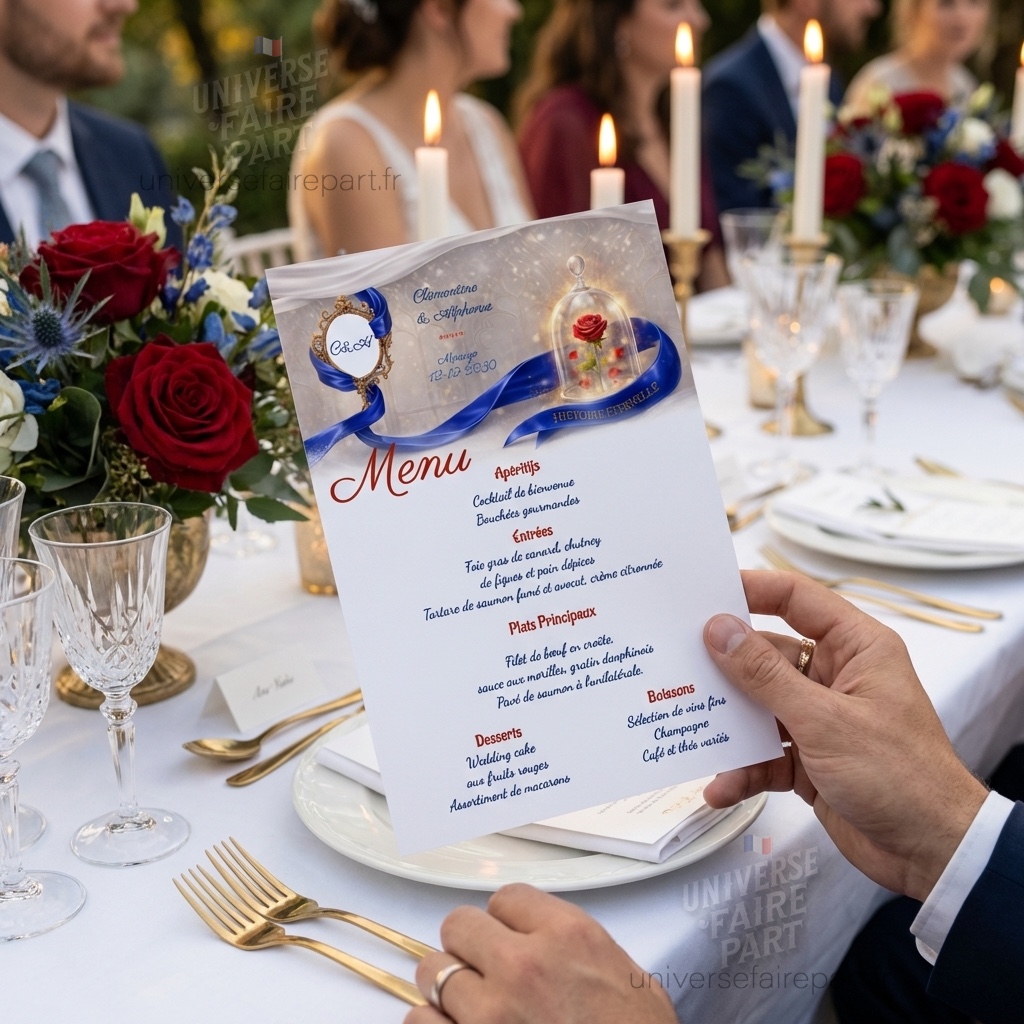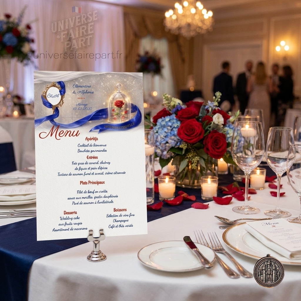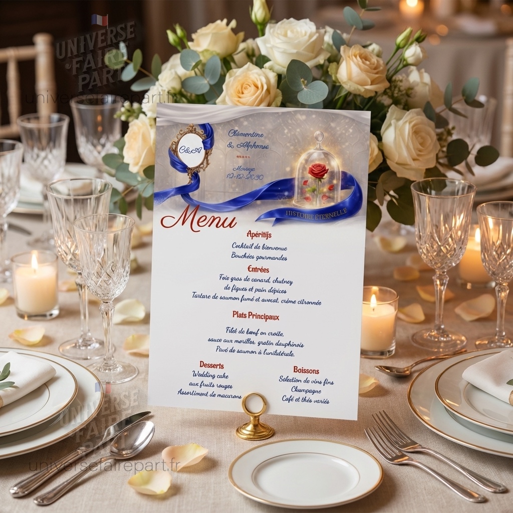 Mots-clés : menu mariage, menu Belle et la Bête, menu Histoire Éternelle, décoration table mariage, papeterie mariage conte de fées, menu personnalisé mariage, design féerique mariage, menu romantique.