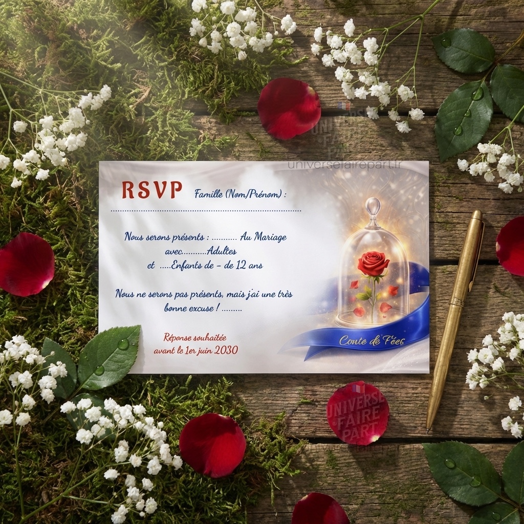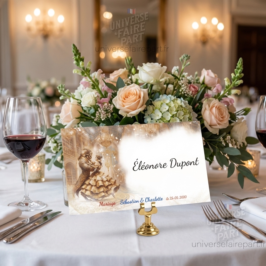 Transformez votre réception de mariage en un véritable conte de fées avec ce superbe menu inspiré de l’Histoire Éternelle de La Belle et la Bête. Ce menu élégant et raffiné est l’accessoire parfait pour compléter votre décoration de table et plonger vos invités dans une ambiance magique. Son design enchanteur, mettant en avant la célèbre rose sous cloche et des détails dorés somptueux, fait de chaque menu une pièce unique qui embellira votre table.