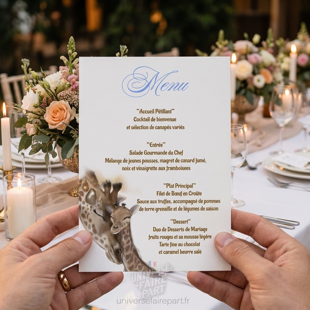 Illustré avec une adorable licorne baby entourée d’un arc-en-ciel sur un fond rose pâle, ce menu est rehaussé de traces discrètes de sabots pour un look harmonieux et raffiné. Il est conçu pour s’intégrer parfaitement dans l’ambiance magique et douce de votre célébration.